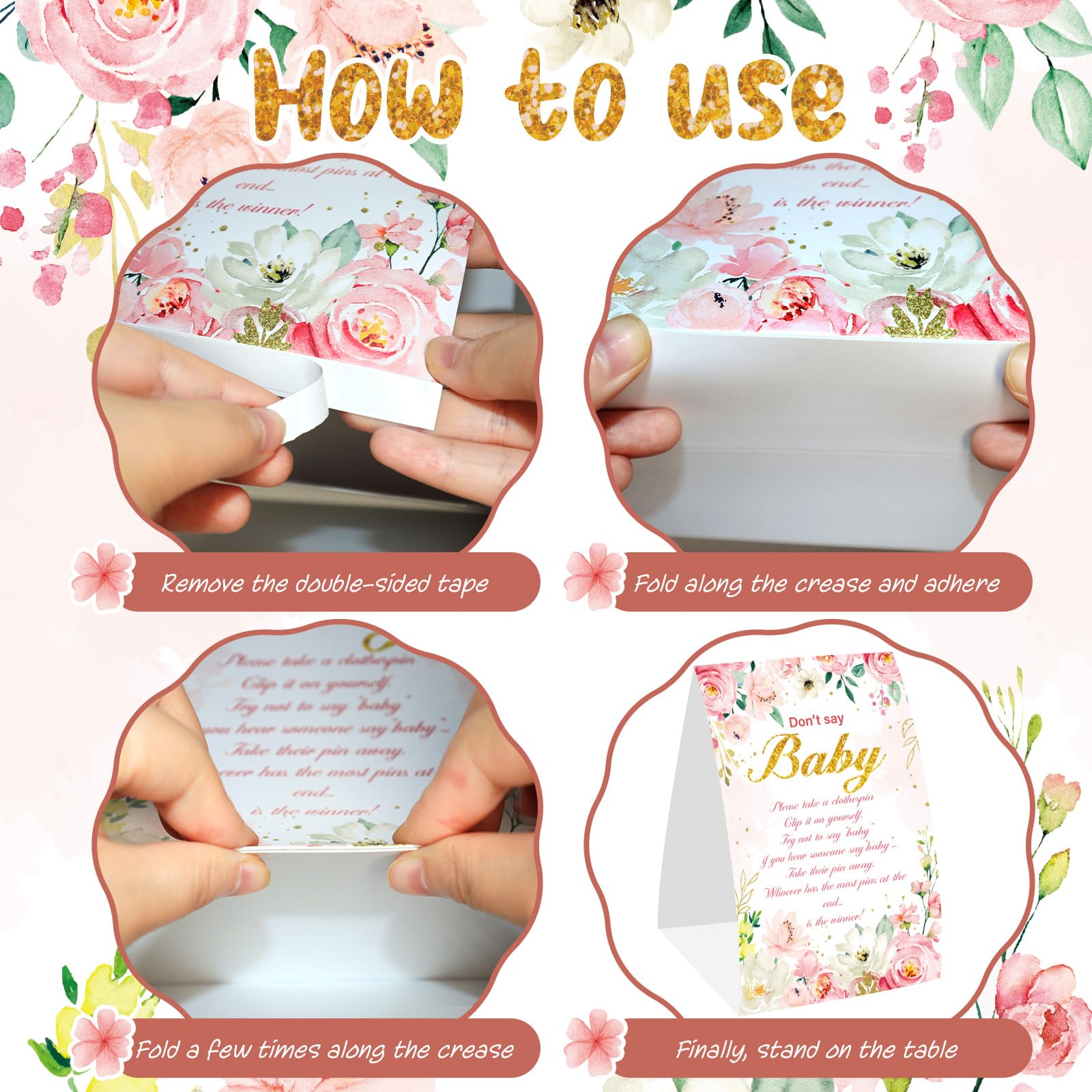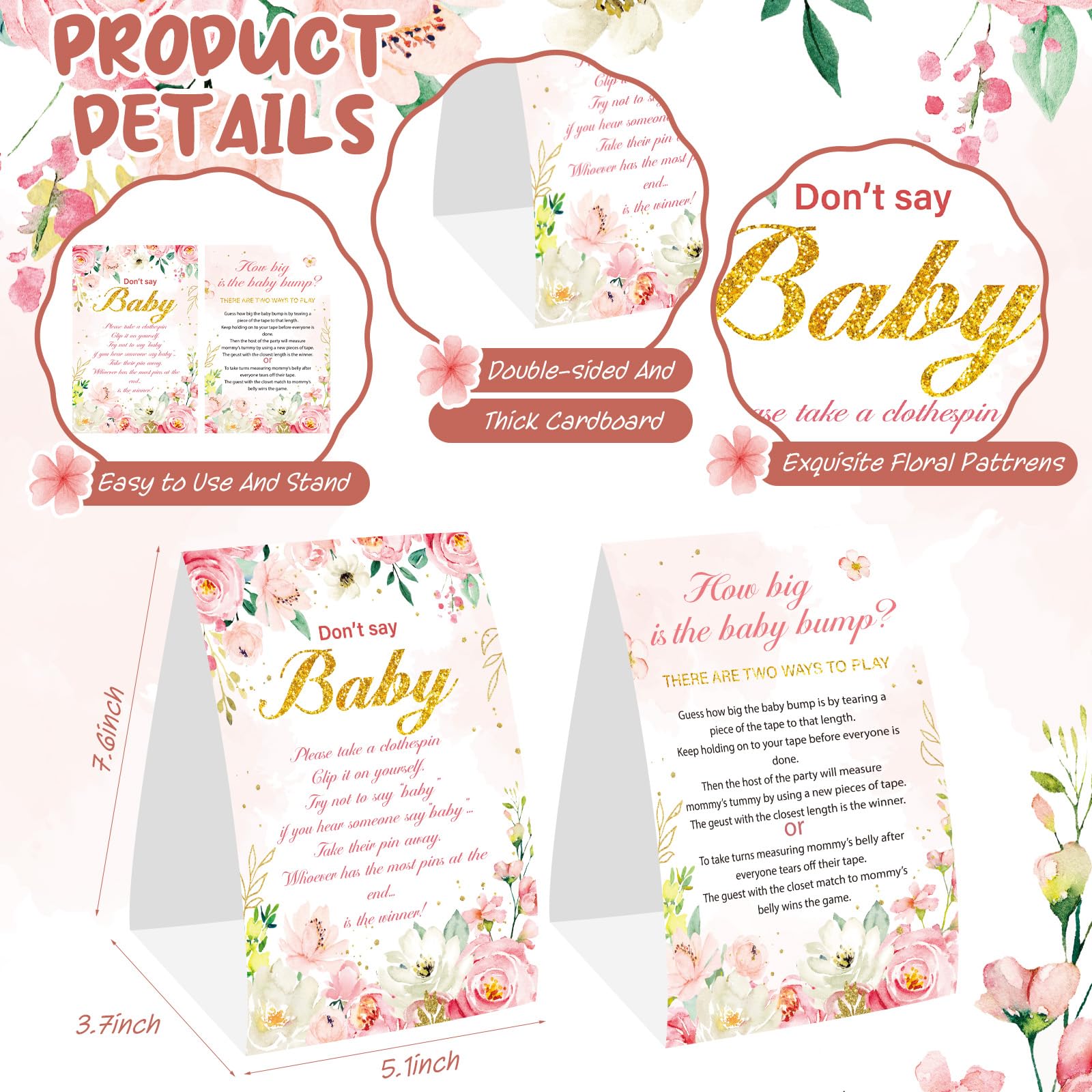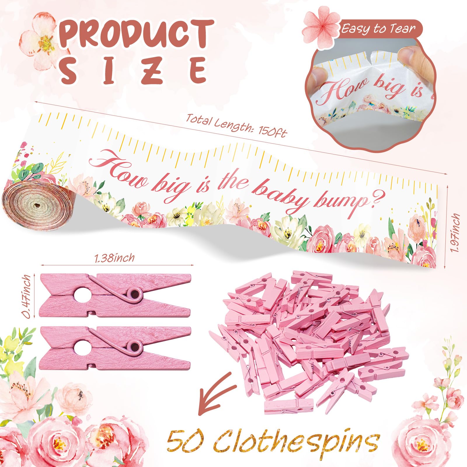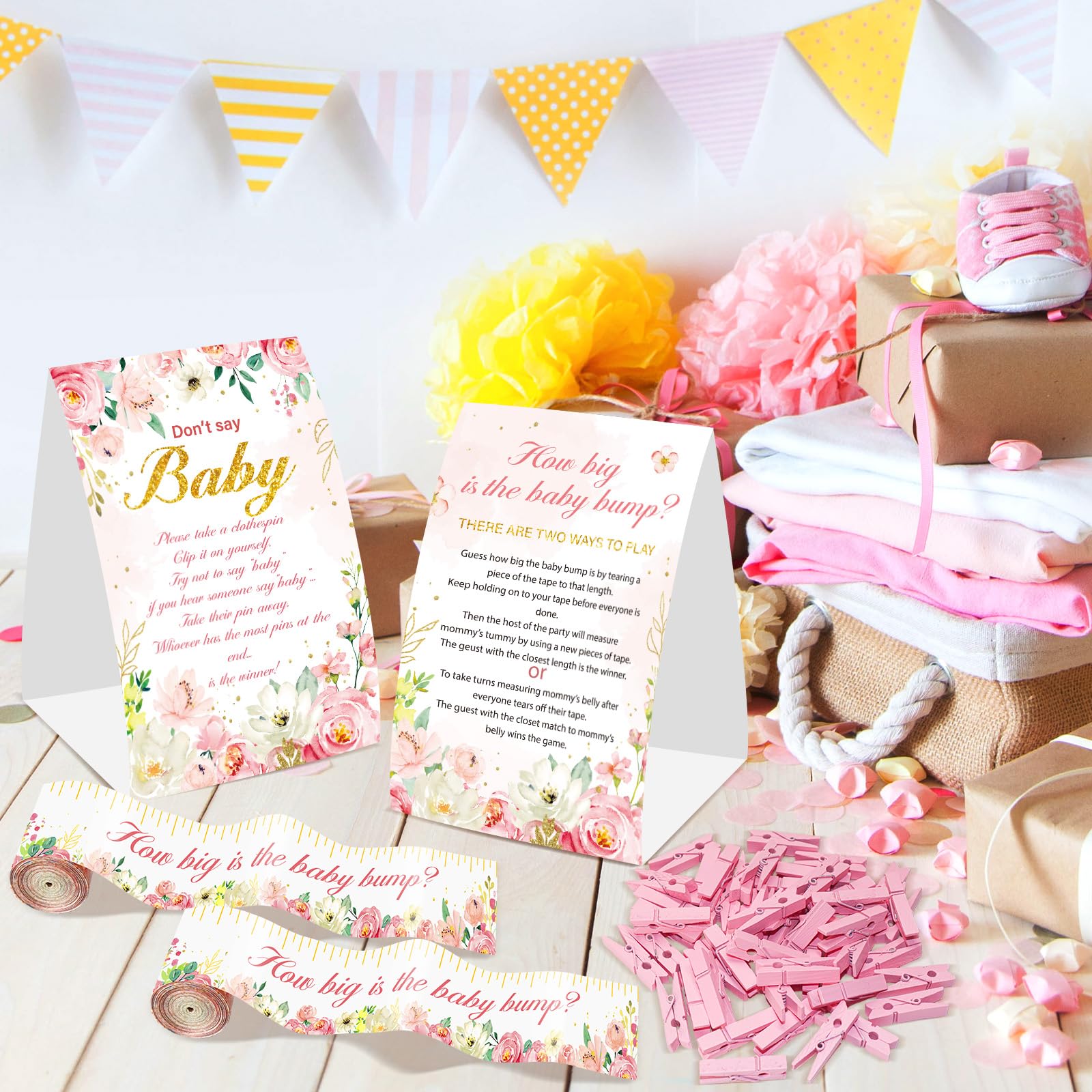 Rich and Perfect Baby Shower Games Set: Package includes 2 floral baby shower game cards: "How big is the baby bump?" and "Don't say Baby", 2 rolls of floral-themed tummy measure tapes, and 50 mini pink clothespins. Enough for every guest to participate in the game