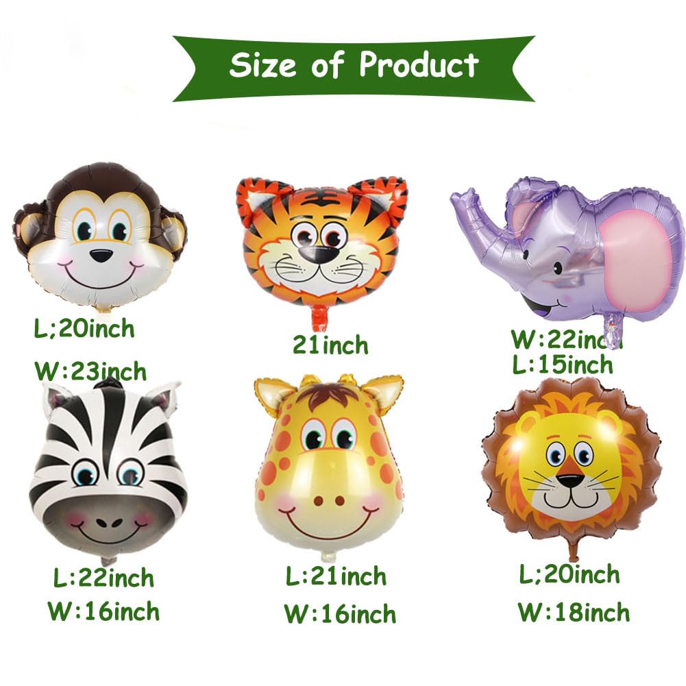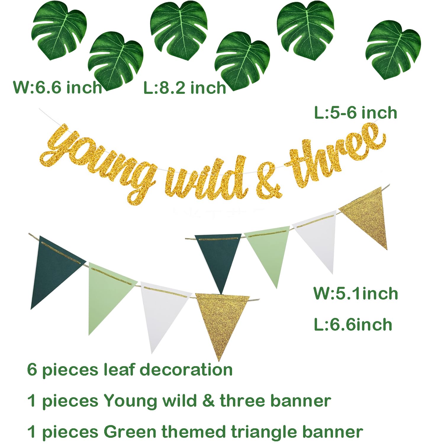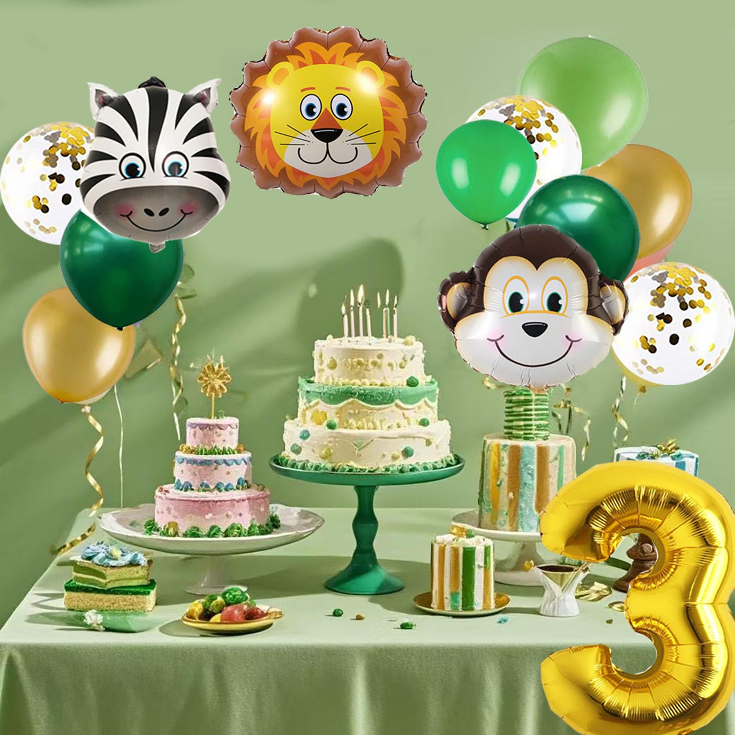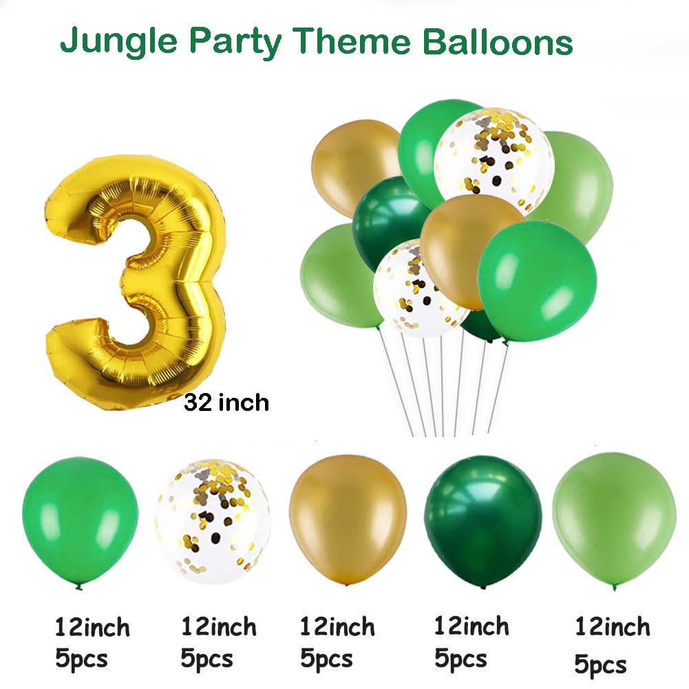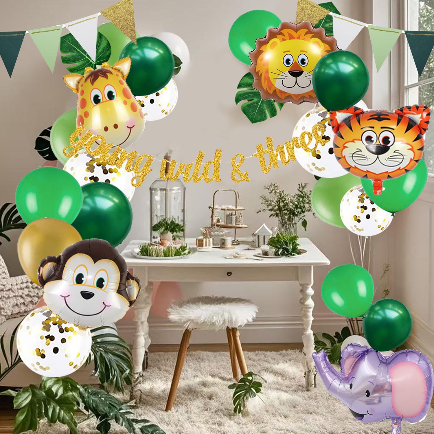 The perfect jungle-themed third birthday decoration set Create great birthday memories Light up our birthday party decorations The package includes 1x gold young wild &three birthday banner 1x green banner 6 x cute medium sized animal head aluminum film balloon 1x number 3 aluminum film balloon 6 x turtle back leaf decoration 25 x 12inch latex balloon 2 x balloon ribbon