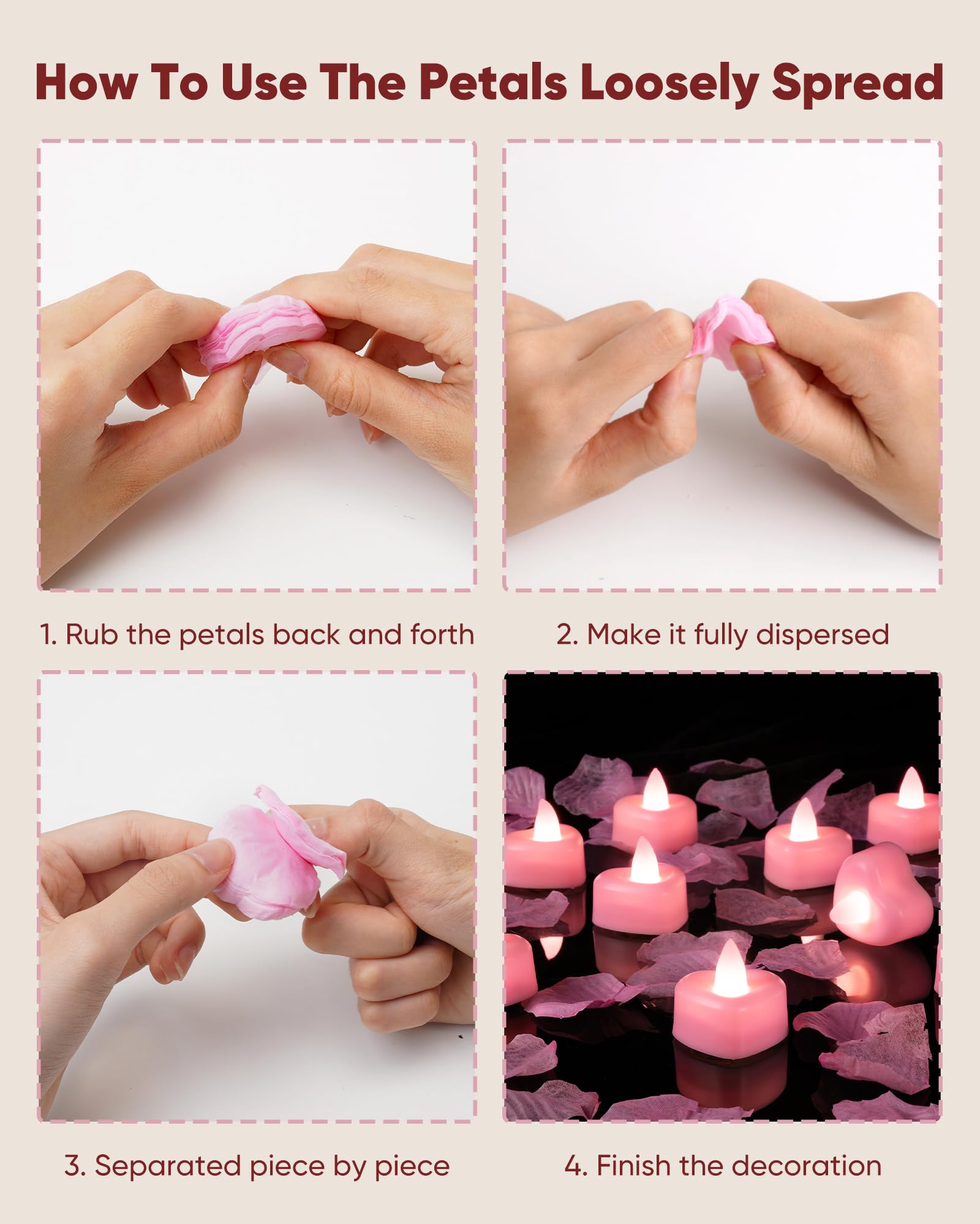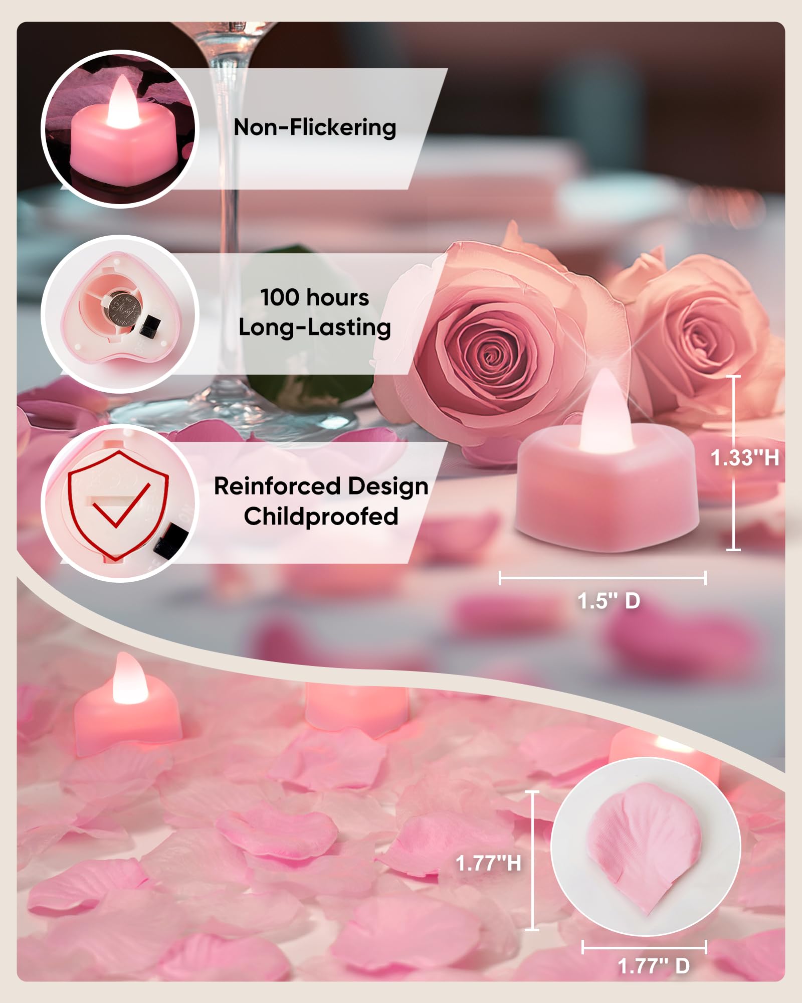 Perfect Size for Any Occasion: The petals measure 1.77x1.77 inches and the flameless tea lights are approximately 1.33" H x 1.5"D, making them ideal for flower girl baskets, wedding aisle, table decorations, or any romantic event you wish to enhance with warmth and charm