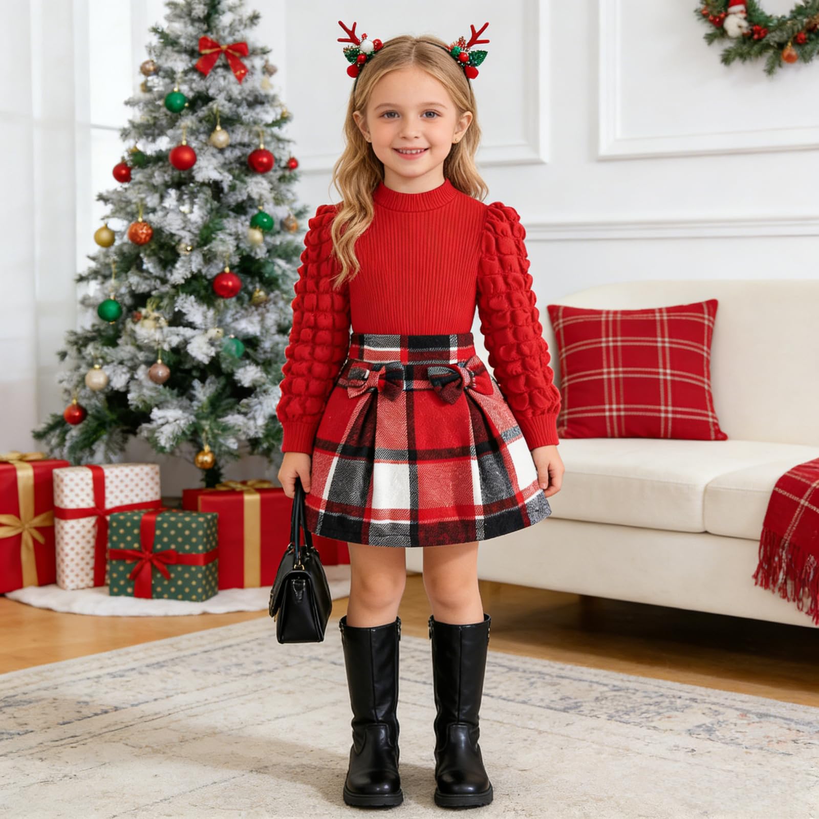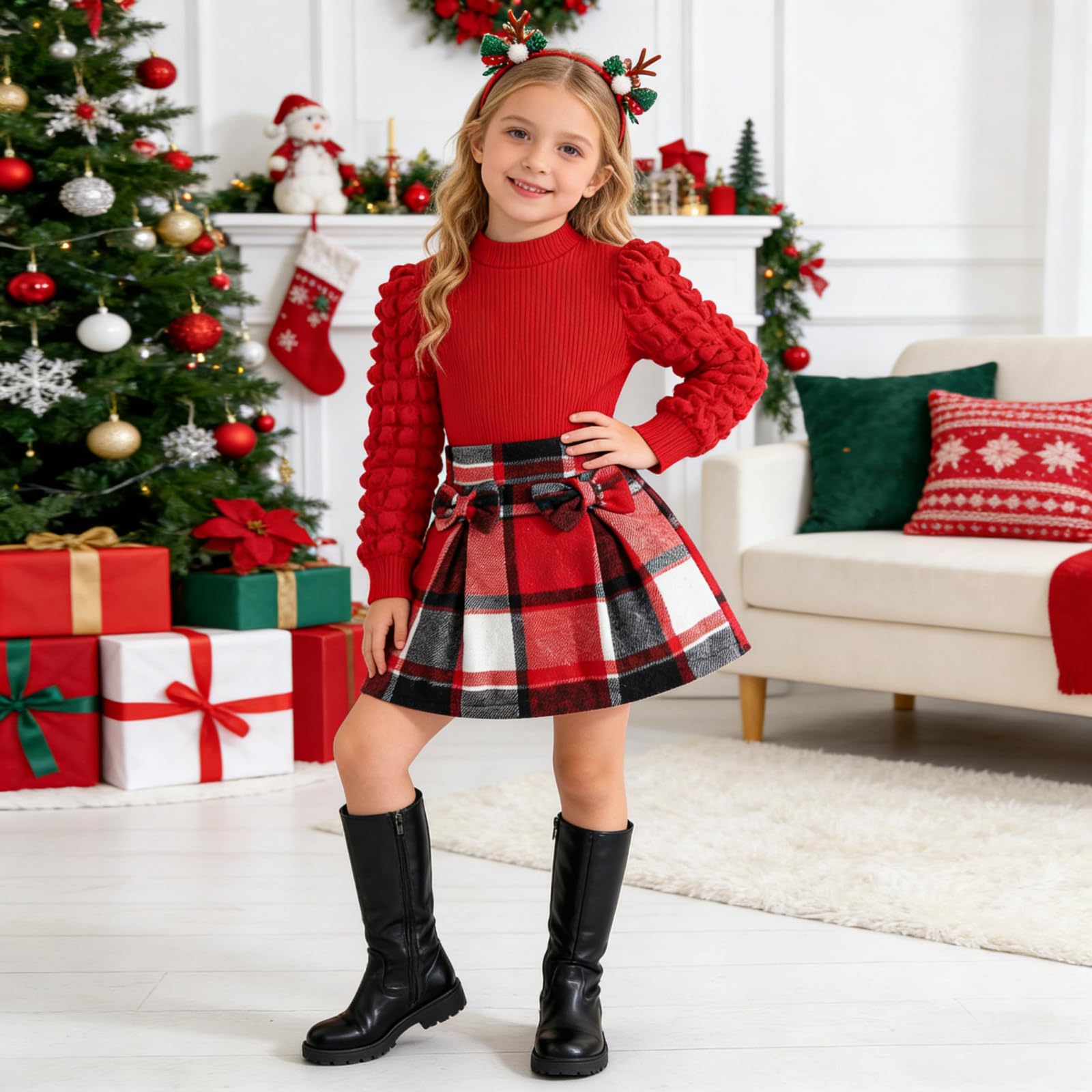 Feature: Christmas outfits for girls,cute lantern puff sleeve,classic red plaid Skirt,comfy ribbed shirt and tweed plaid skirt set, girls plaid skirt with delicate bowknot decoration,lovely and stylish, Suitable for your little princess in autumn winter and Christmas wear.