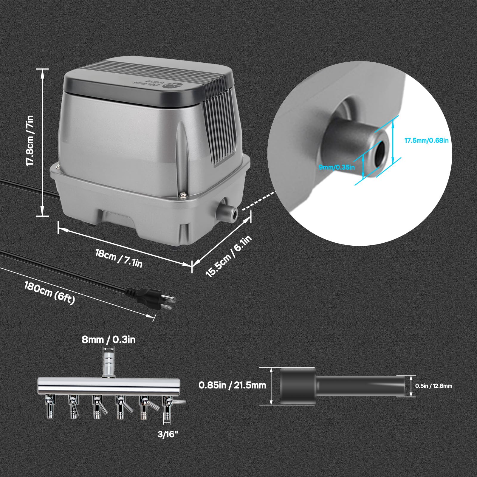 PACKAGE - The pond air pump comes with a heavy-duty chrome-coated air diffuser (6 outlets with air volume regulators) to connect to air stones. Note: Airline tubing and air stones should be purchased separately.