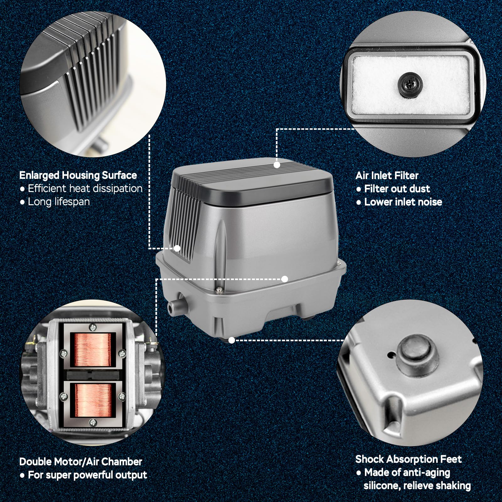 GREAT HEAT DISSIPATION - The enlarged housing and optimized design of this septic air pump ensure superior heat dissipation, preventing overheating even during 24/7 operation. Keeps internal components at lower temperatures to extend pump life.
