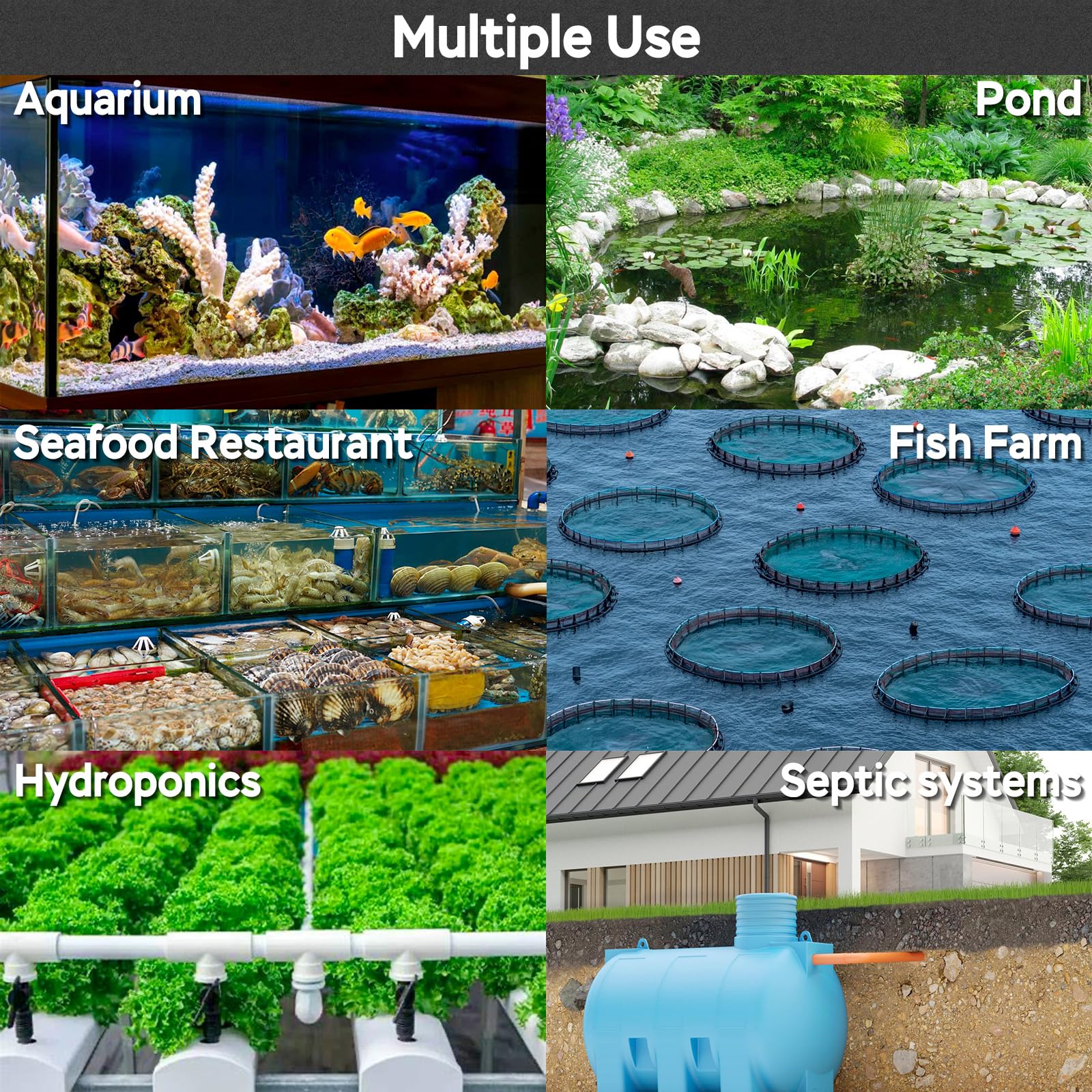VERSATILITY - Ponds/Fish Farms/Seafood Tanks: Maintain optimal oxygen levels. Septic Systems: Accelerate waste breakdown. Hydroponics: Supercharge root growth. This pond bubbler handles the toughest oxygenation challenges with ease!