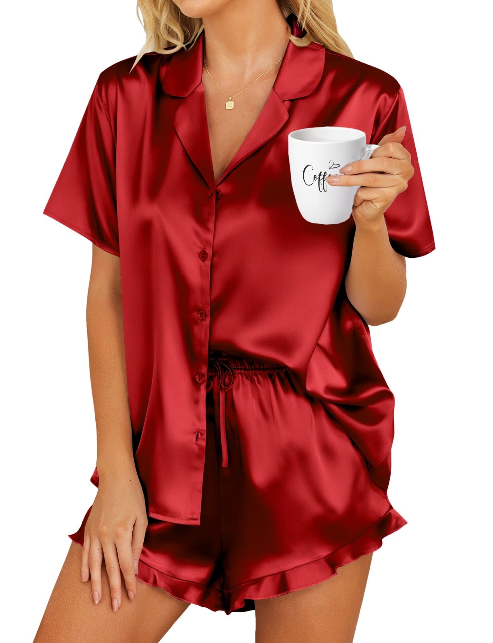 【Fit Occasion】: This Basic Silk Pajama Set With Ruffled Shorts is perfect suit for more casual occasions. such as Pajama Party, Bridal Party, Lounging Room,Travel, Holiday, ect.