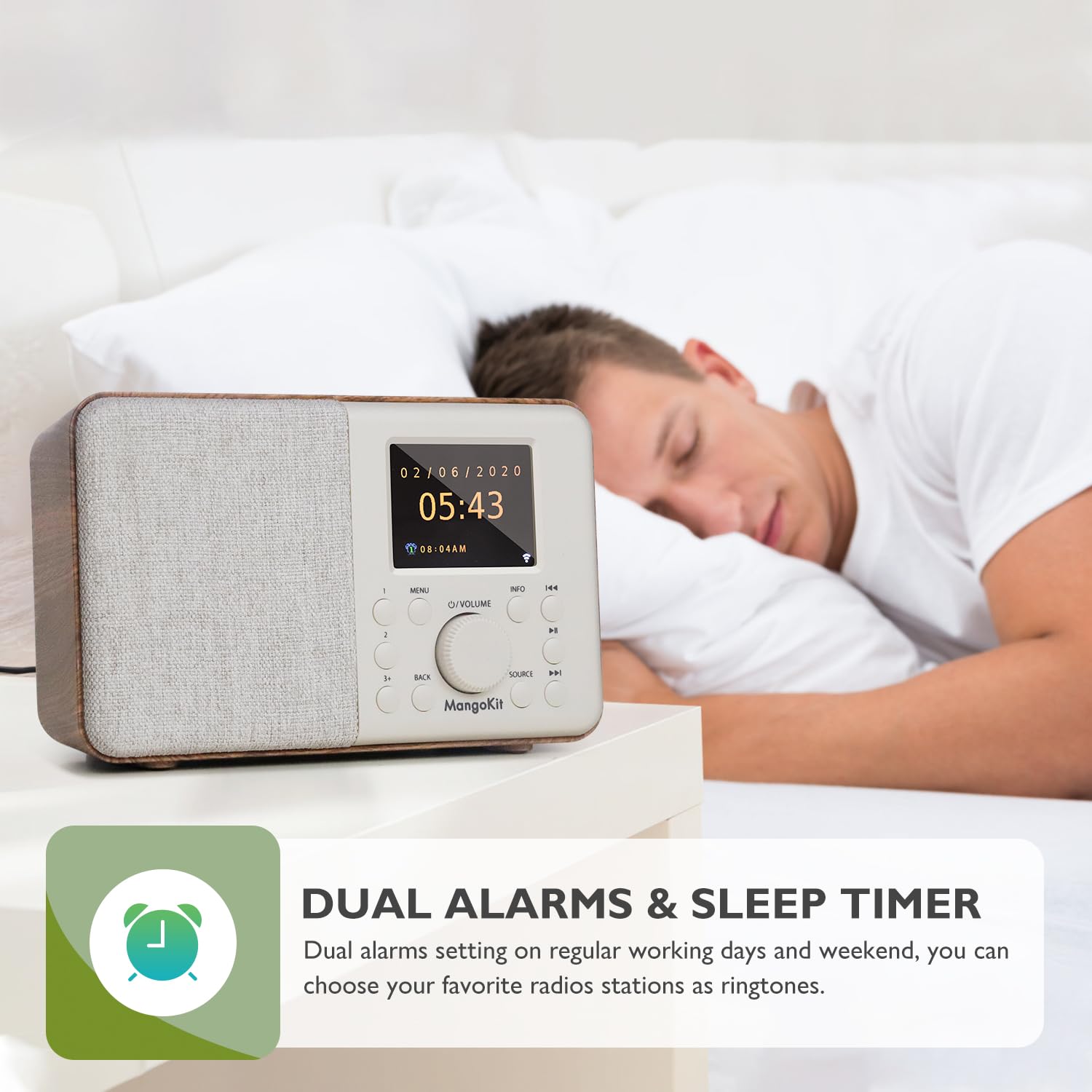 Dual Alarms, Sleep & Snooze – Wake up your way with two independent alarms—weekday/weekend settings, gradual volume increase, and choice of DAB, FM, internet station or buzzer. Includes snooze for those extra minutes in bed, plus a sleep timer to drift off to your favourite station. Ideal as a reliable bedside companion for daily routines.
