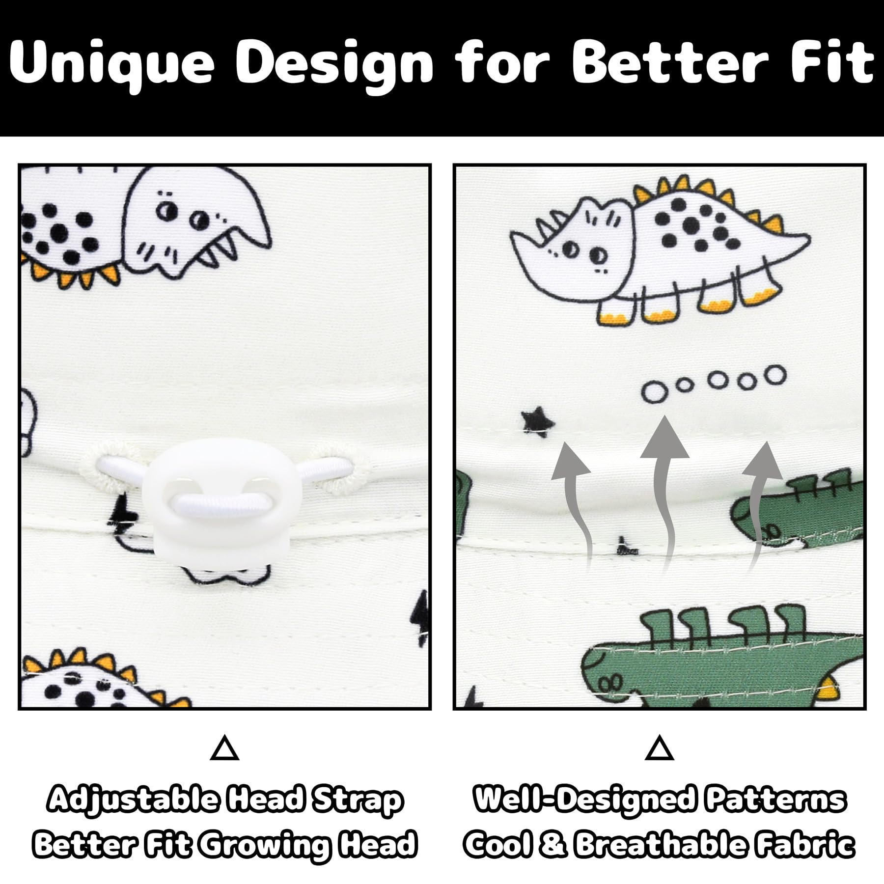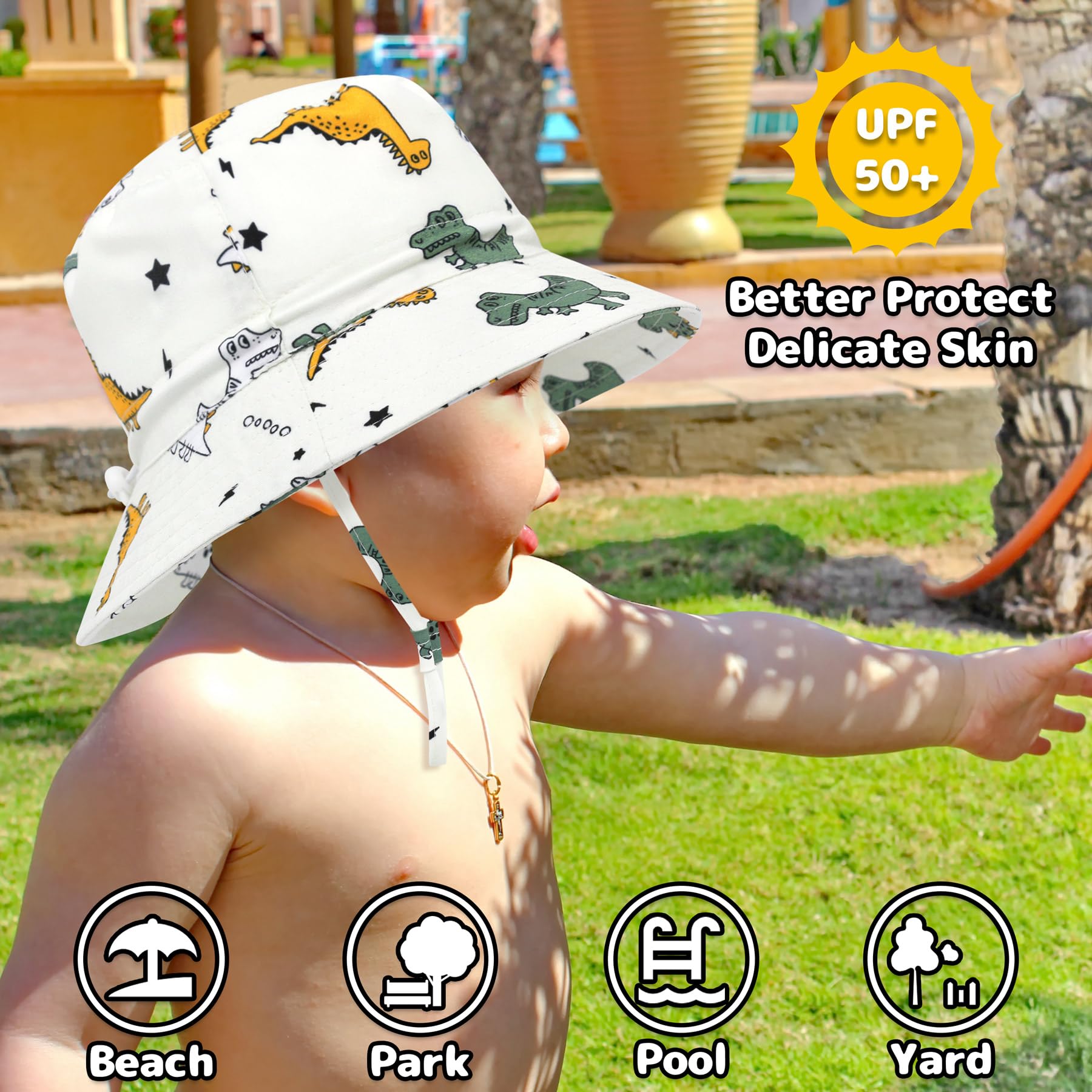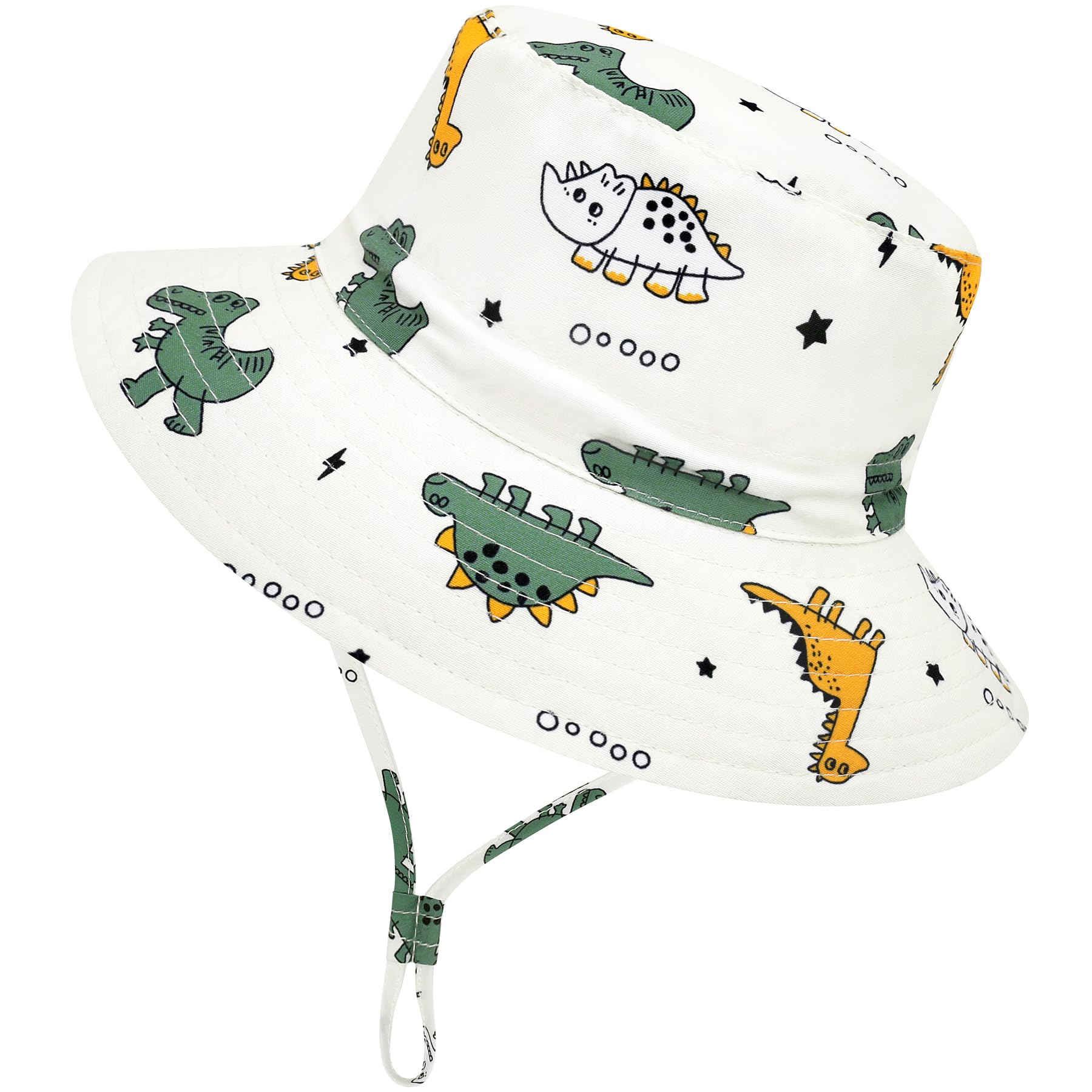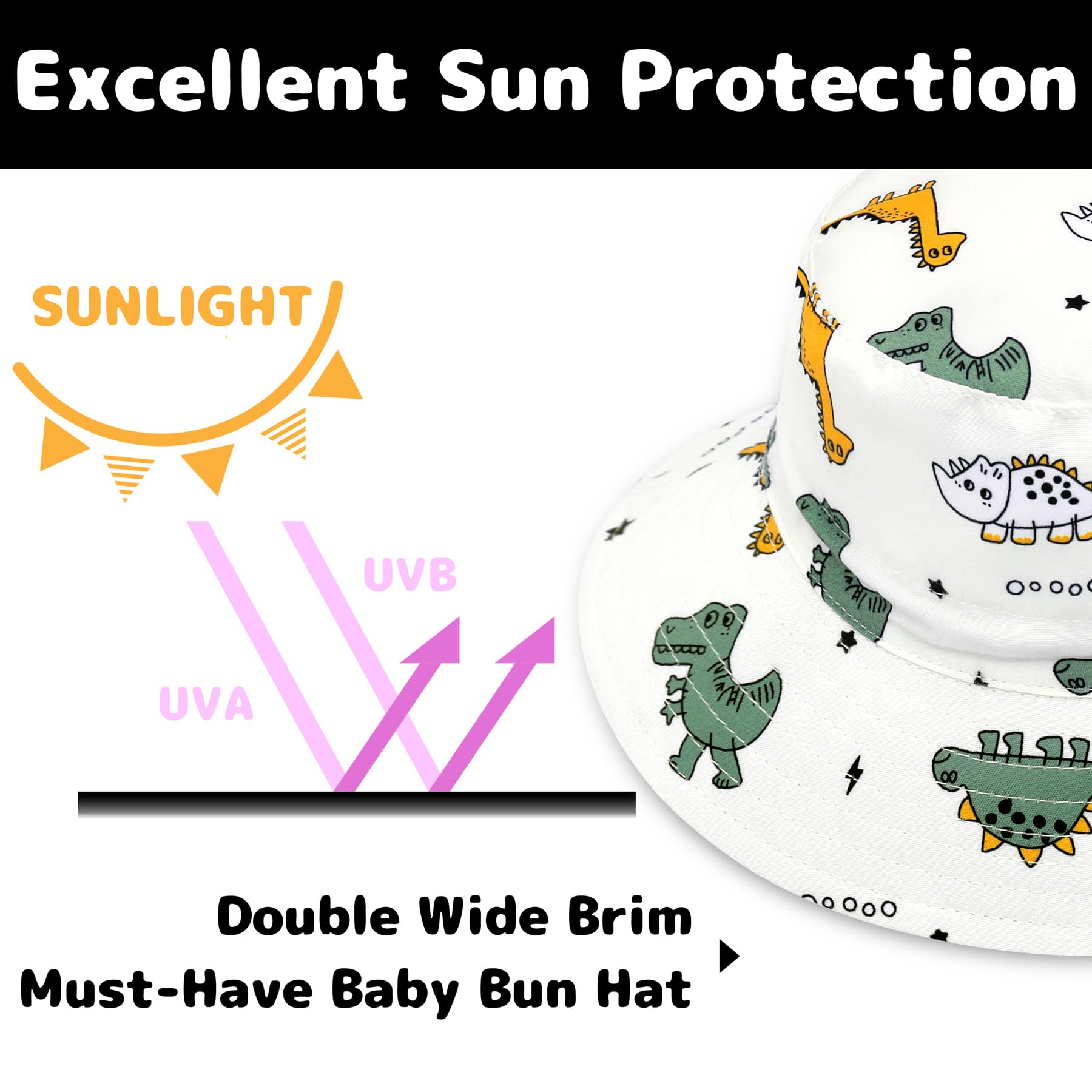 DUABLE ADJUSTABLE DESIGNS: The baby bucket hat is specially featured with head and chin strap. The adjustable head strap makes it super convenient to adapt to baby's different head circumference and allows for better fit. And the chin strap can keep the infant sun hat fixed well on the head and protect it from being blown away on windy days. These double adjustments will guarantee more security and comfort. What's more, our sun hats for toddlers are so lightweight that they are easy to carry.