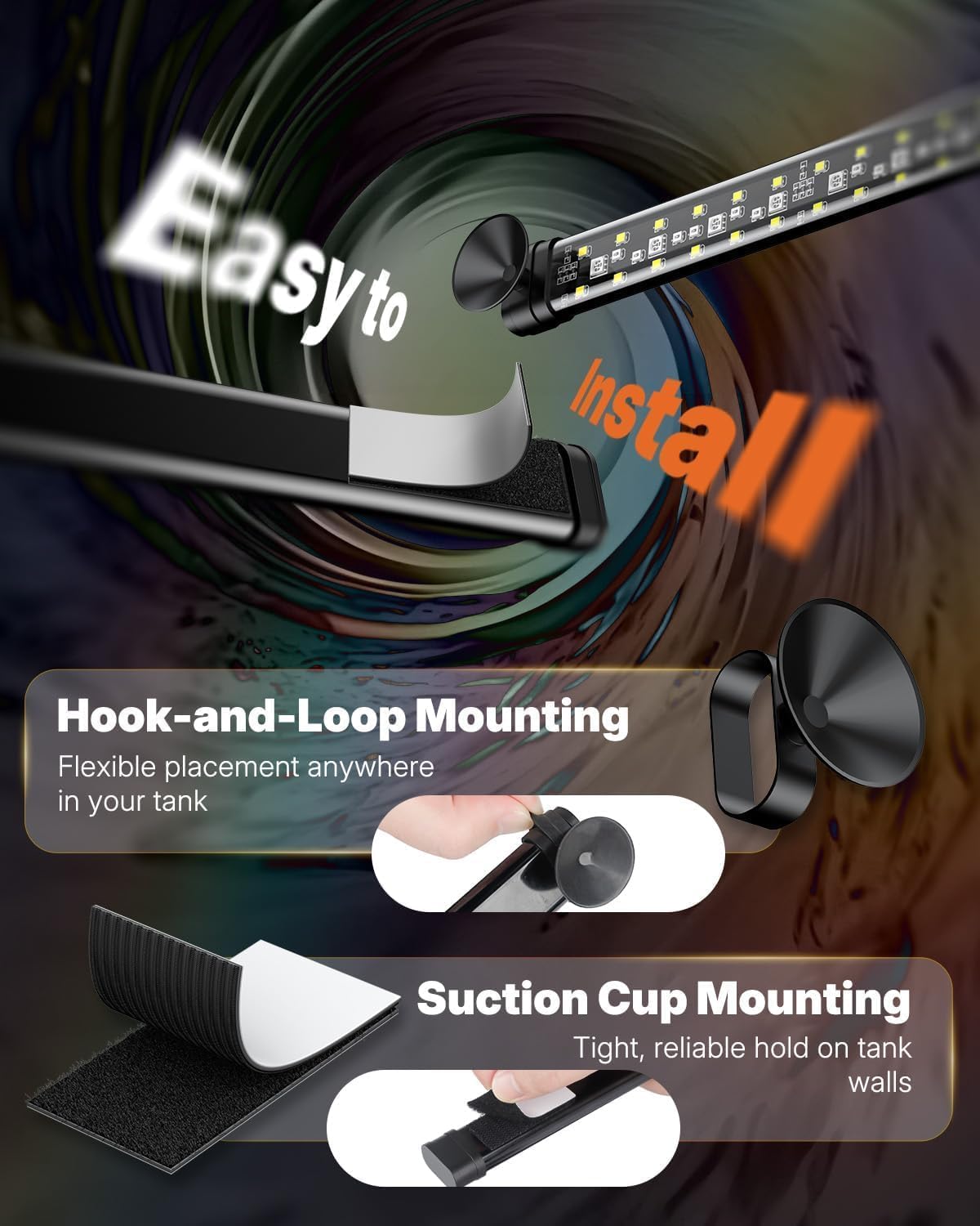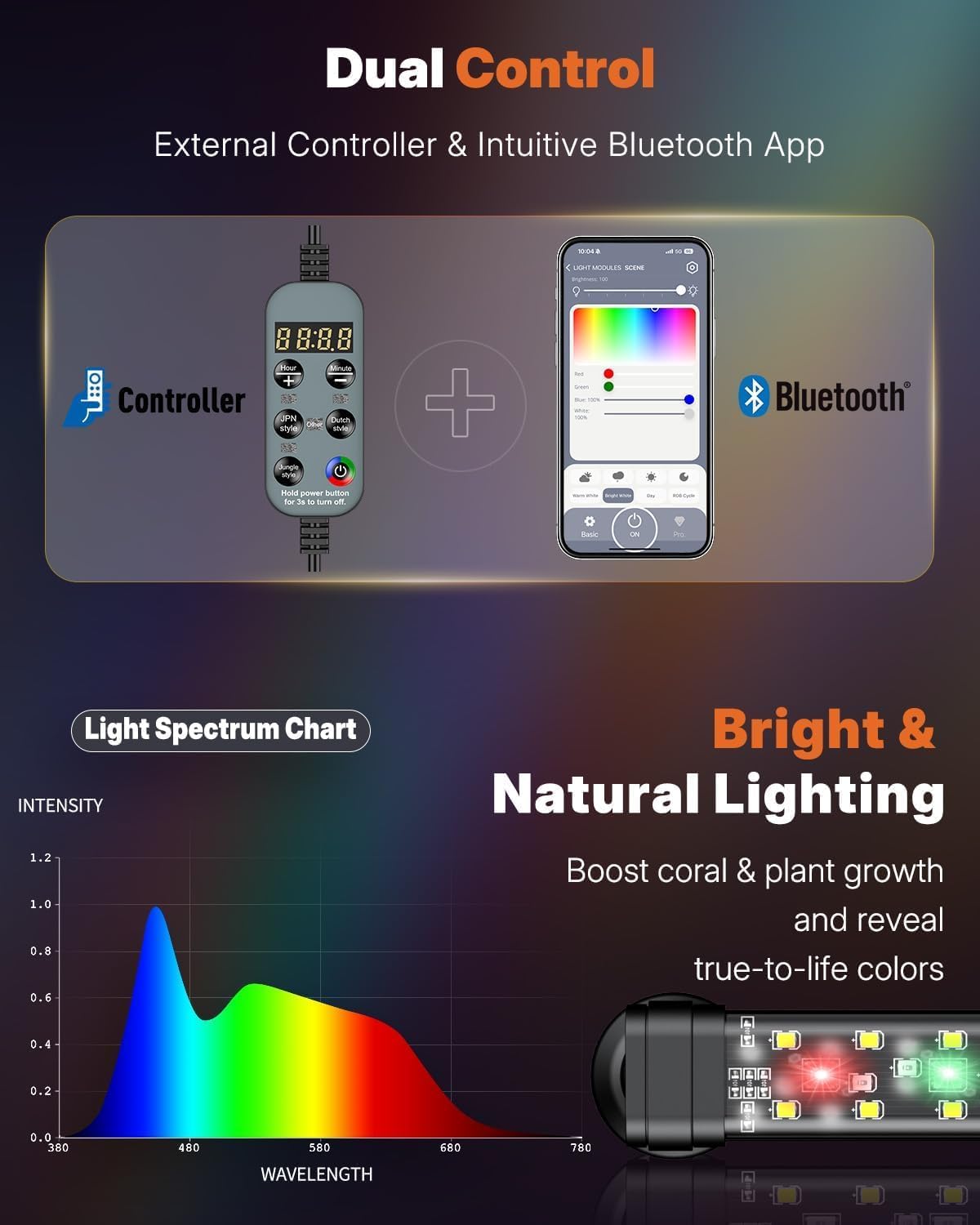 Bright & Natural Aquarium Lighting: Full spectrum (6500 K white, 660 nm red, 525 nm green, 455 nm blue) with ultra-high CRI (98). Ideal for boosting coral and plant growth and reproducing true-to-life colors to enhance your aquarium’s natural beauty