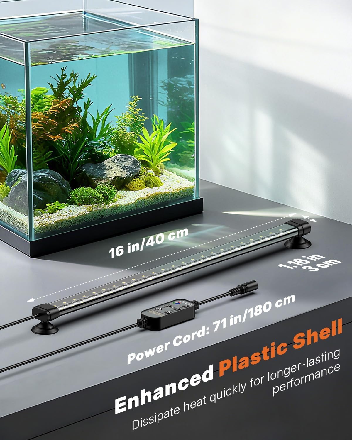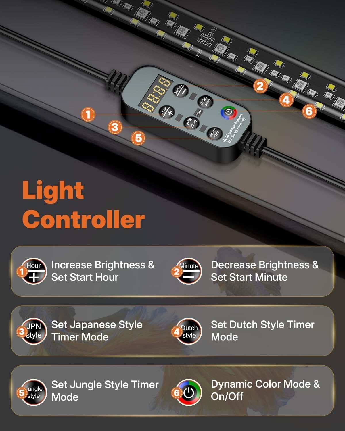 3 Automatic Day-Night Timers: Set Dutch, Jungle, and Japanese timer modes via the controller to automatically turn the LED light on and off, simulating the 24/7 natural day-night cycle from sunrise to night to keep your aquatic life active and thriving