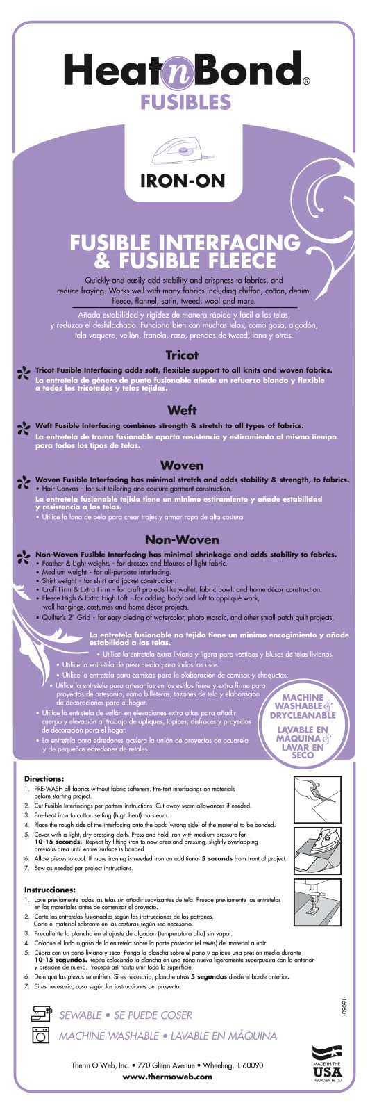 USA-made, 20" width, machine washable/dryable, 100% polyester non-woven fusible interfacing