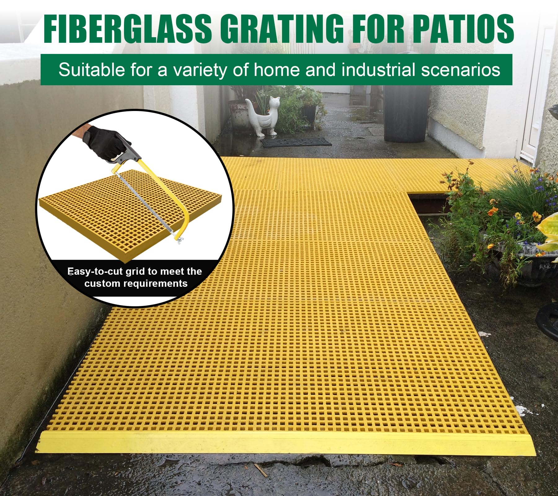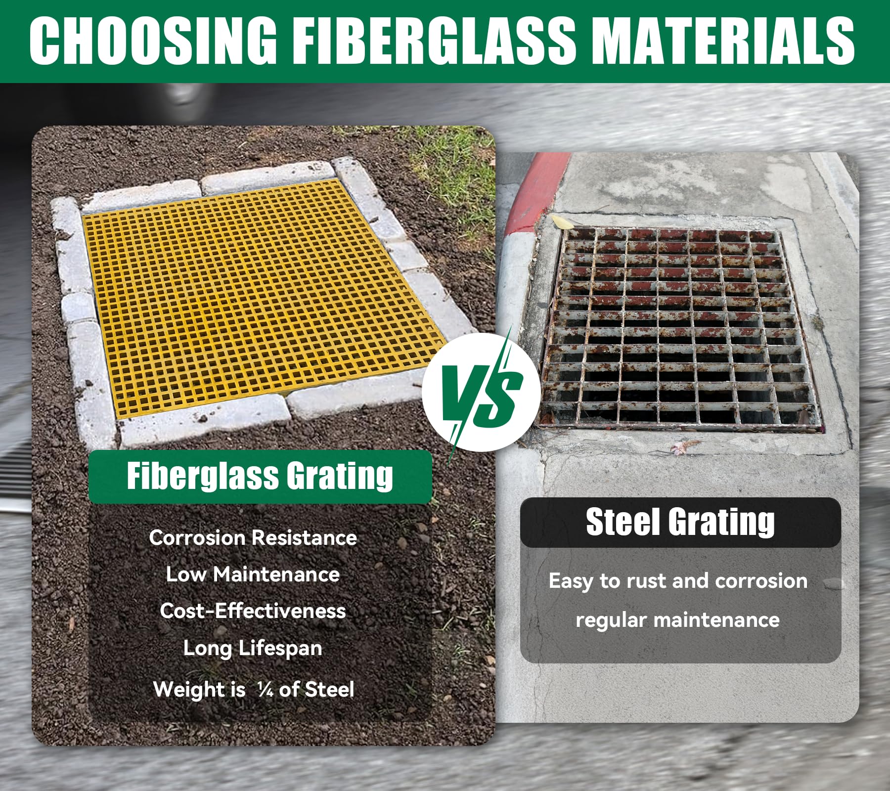 【Easy to Cutting and Install】Molded fiberglass grating can be cut into any shape or size to fit the trenches outside the facilities or stairs. Use Fasteners for Fiberglass Bar Grating to secure