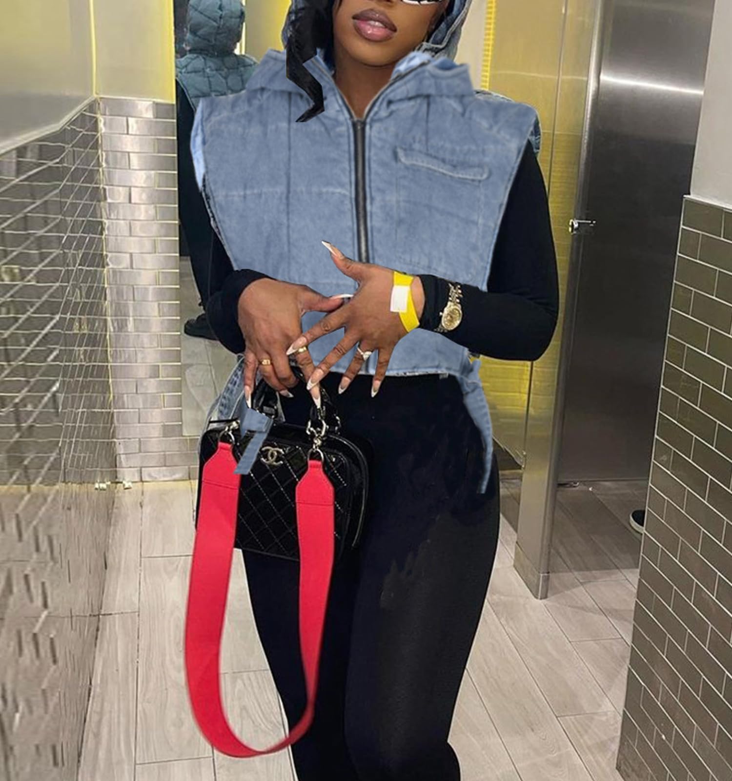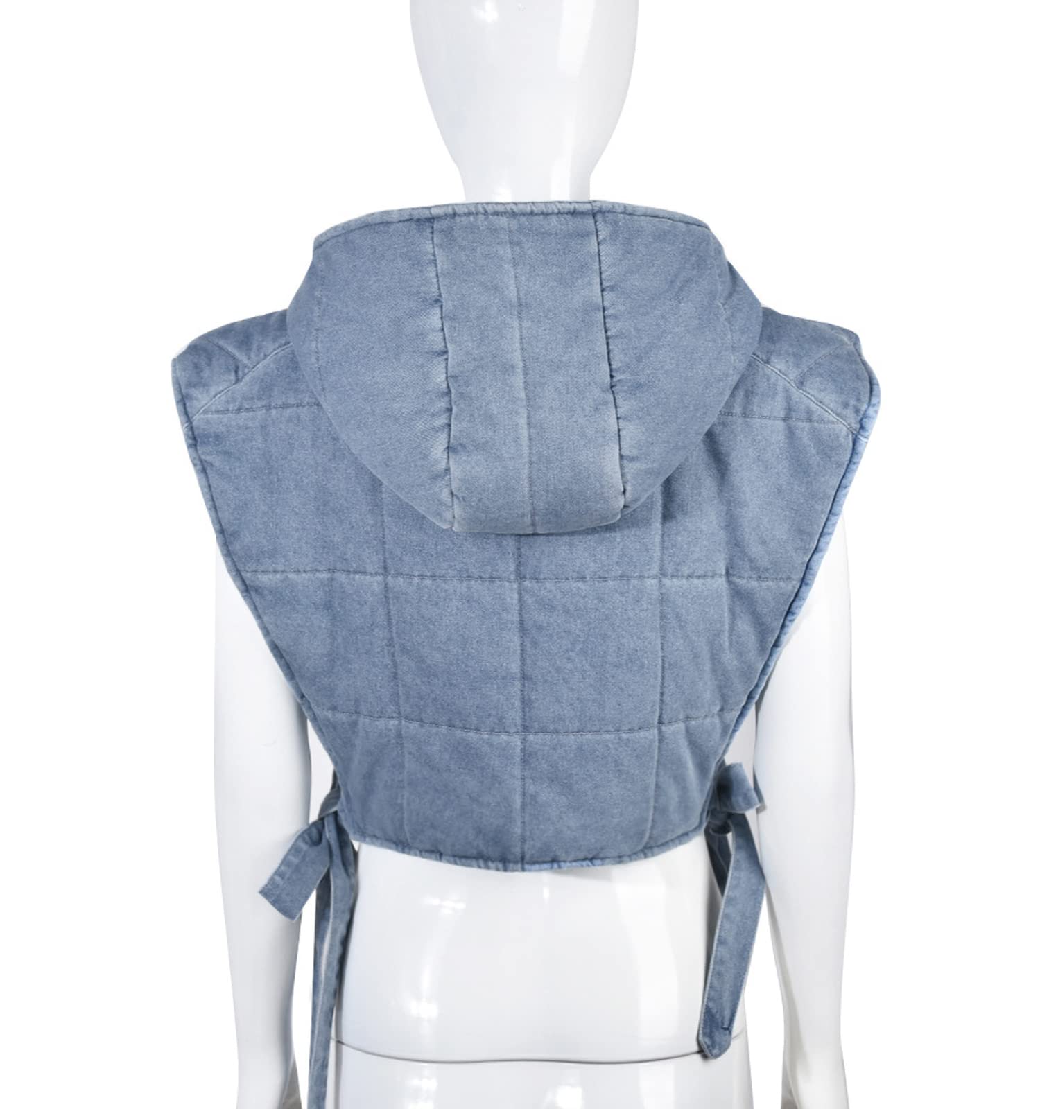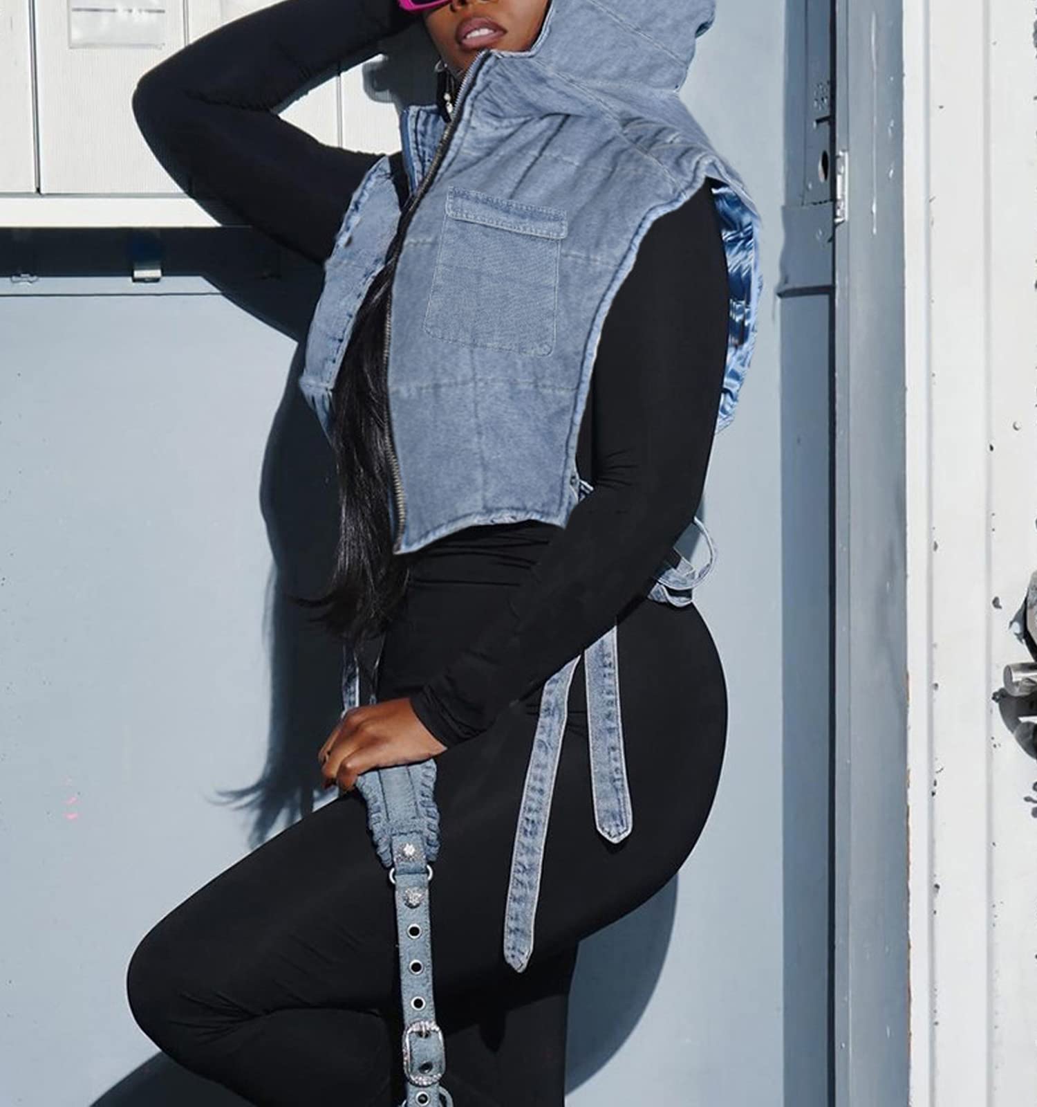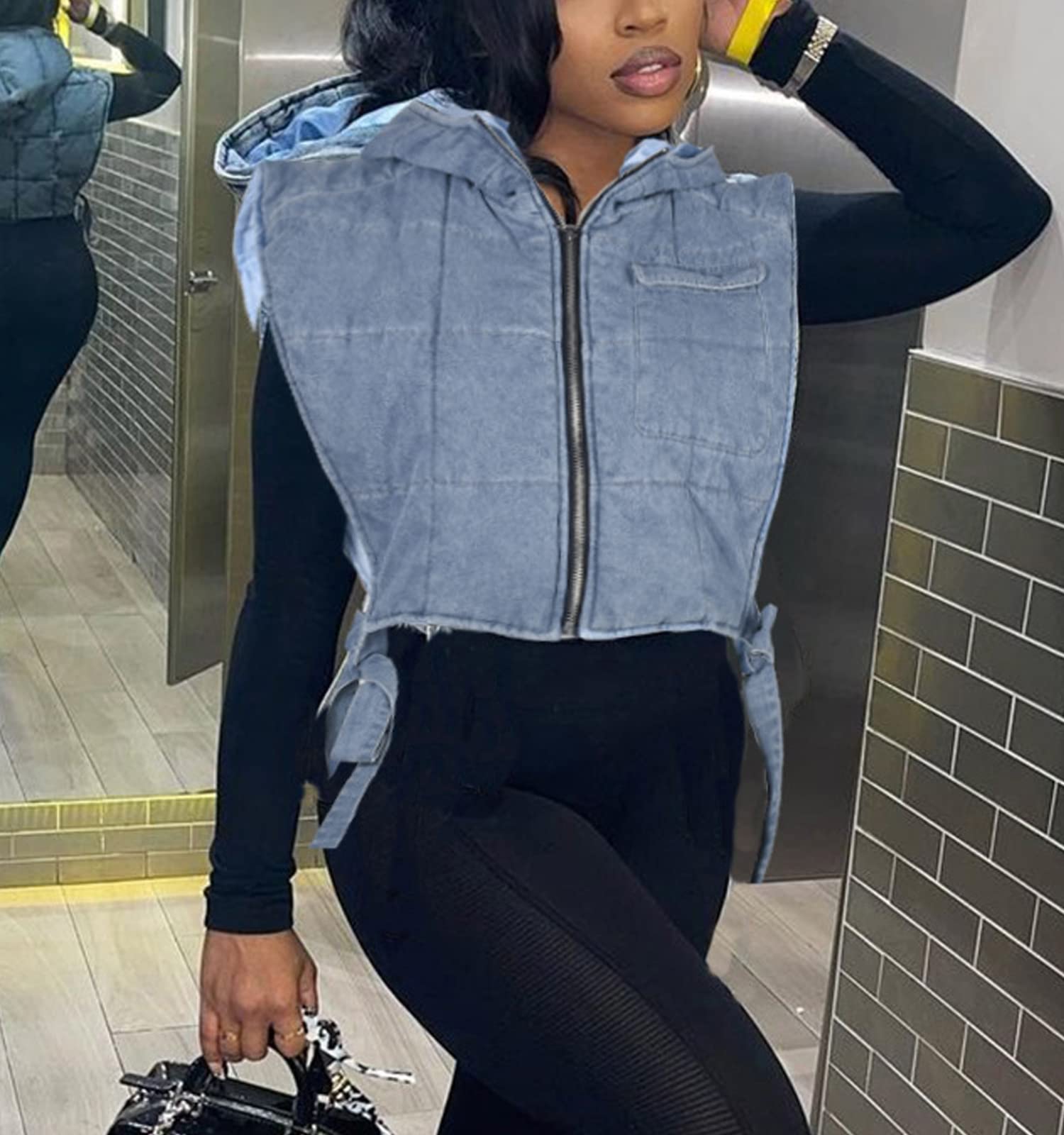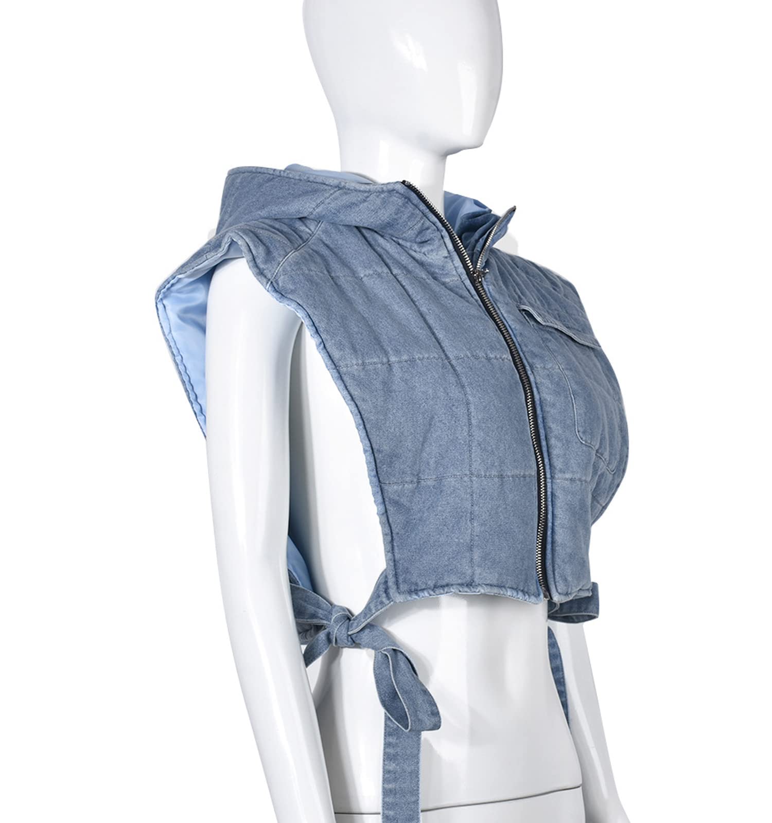 Feature:Zip up closure, side self-tie, loose fit, deep sleeveless and hooded design, cropped, a chest pocket, lightweight Y2K jean crop puffer streetwear.