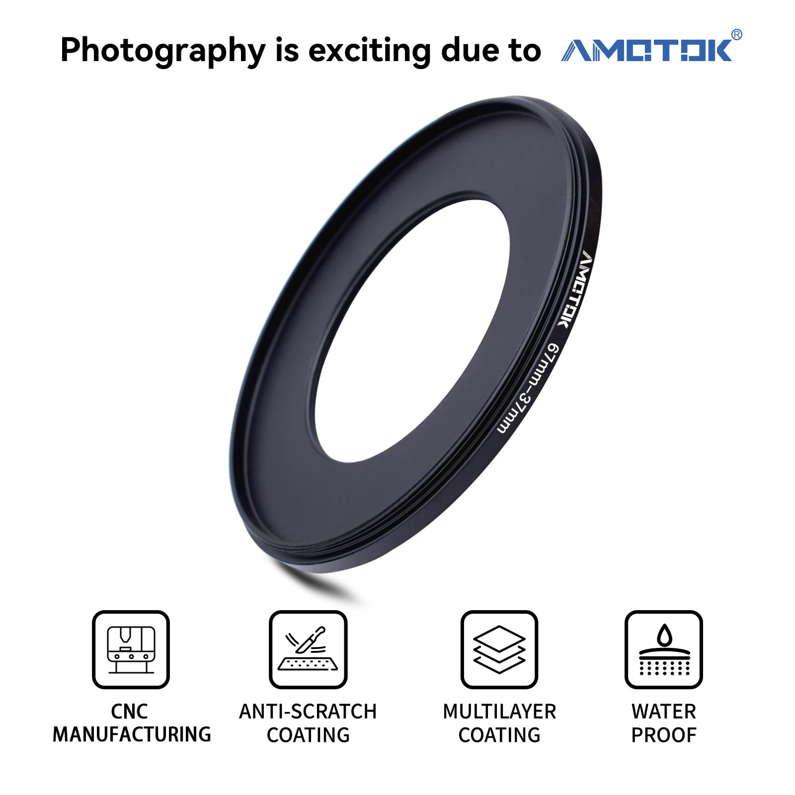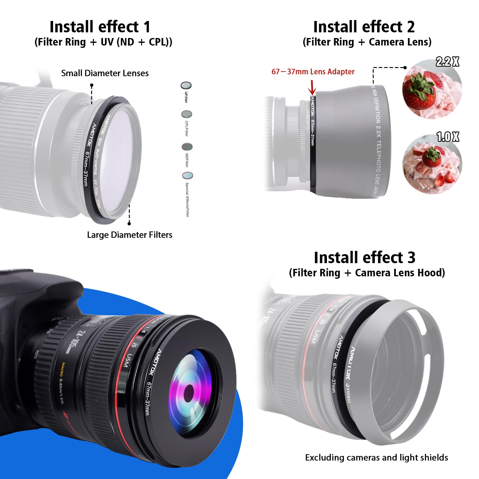 【2】AMOTOK The ring adapter easily screws onto the front of any 67mm lens,and converts the thread size of your lens to the thread size of any other 37mm accessory(such as filters,hoods,flashes and lens converters),and other 37mm accessories.