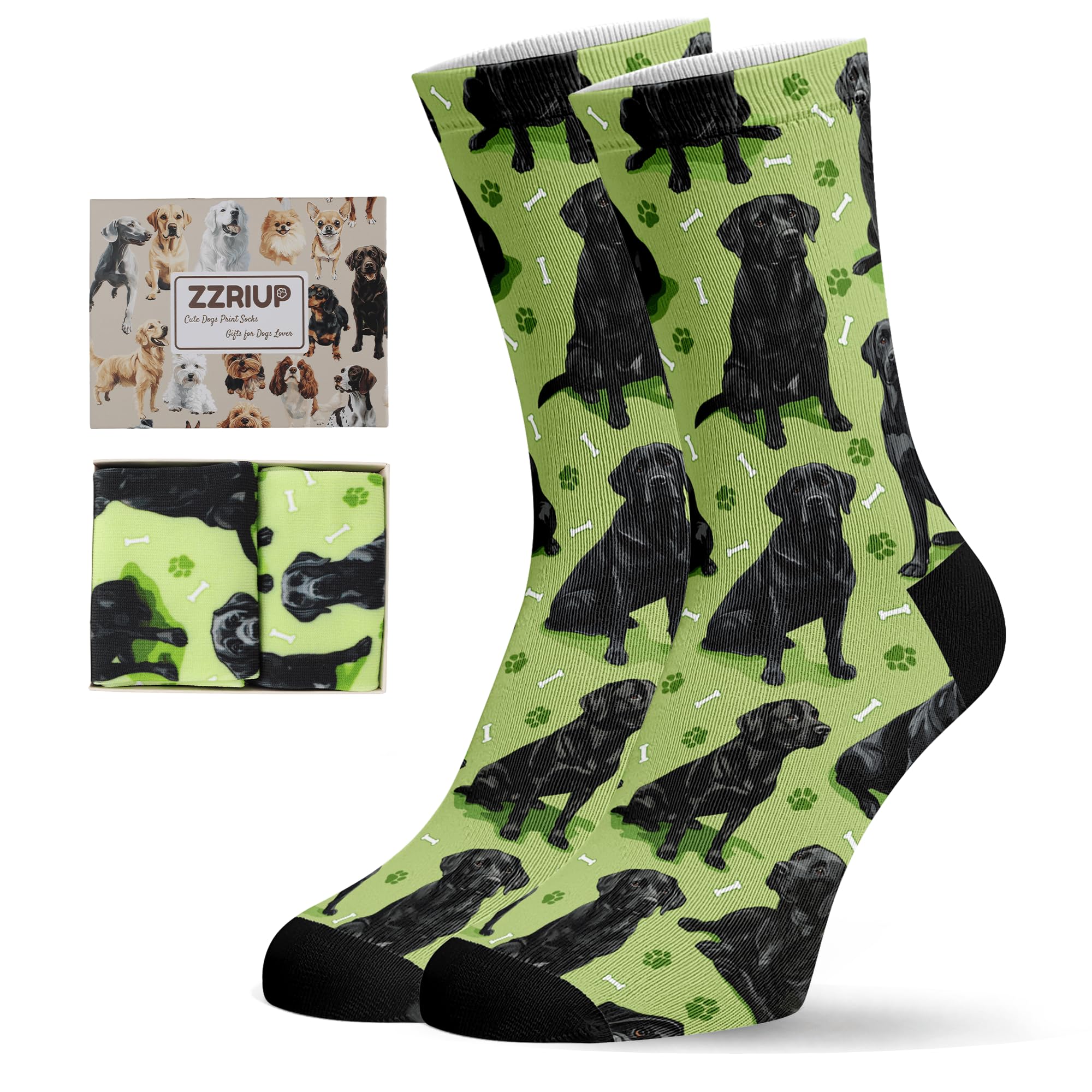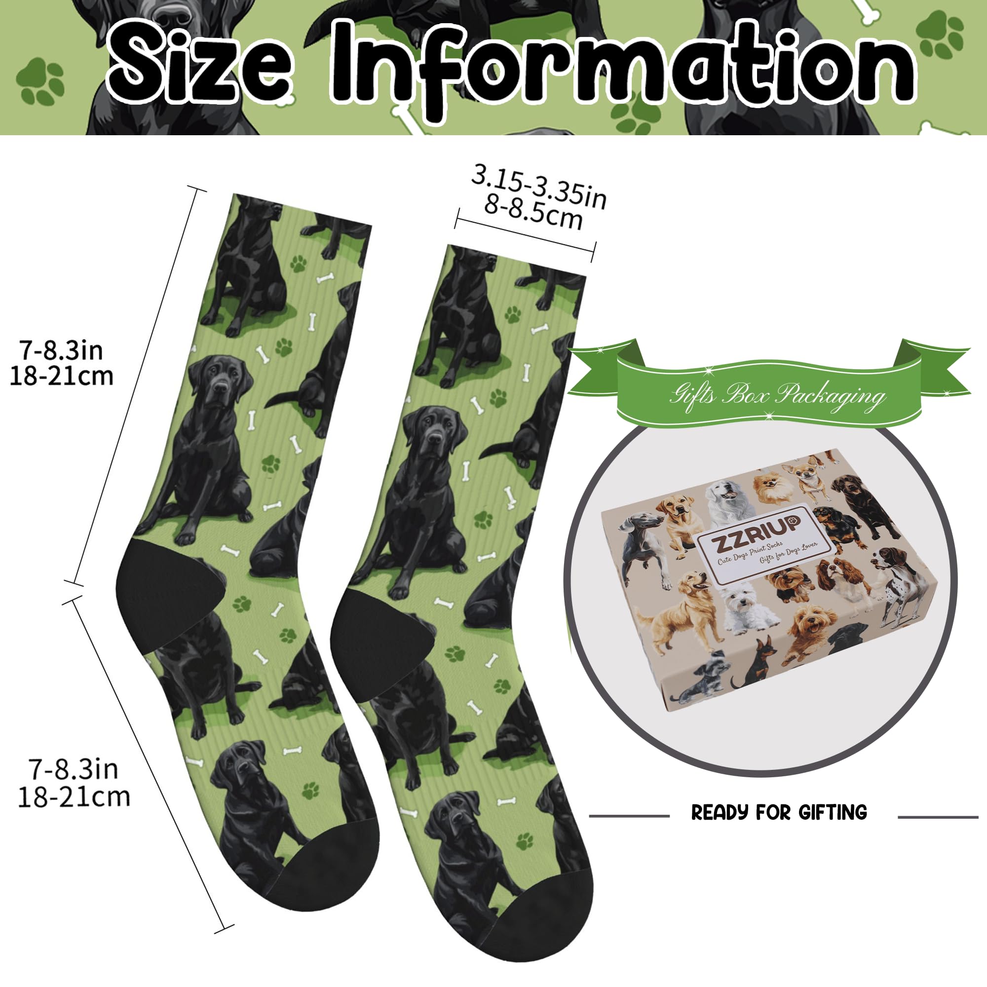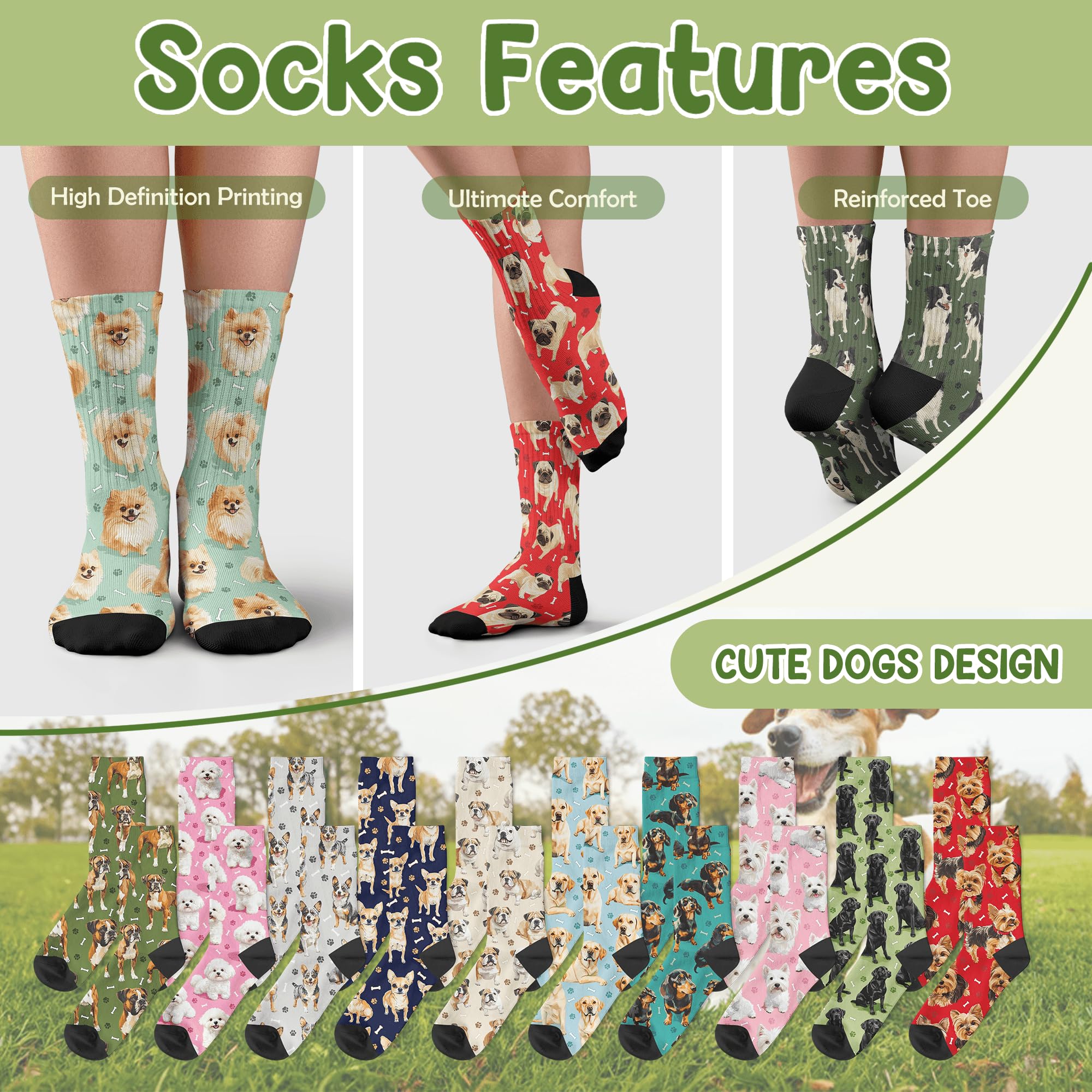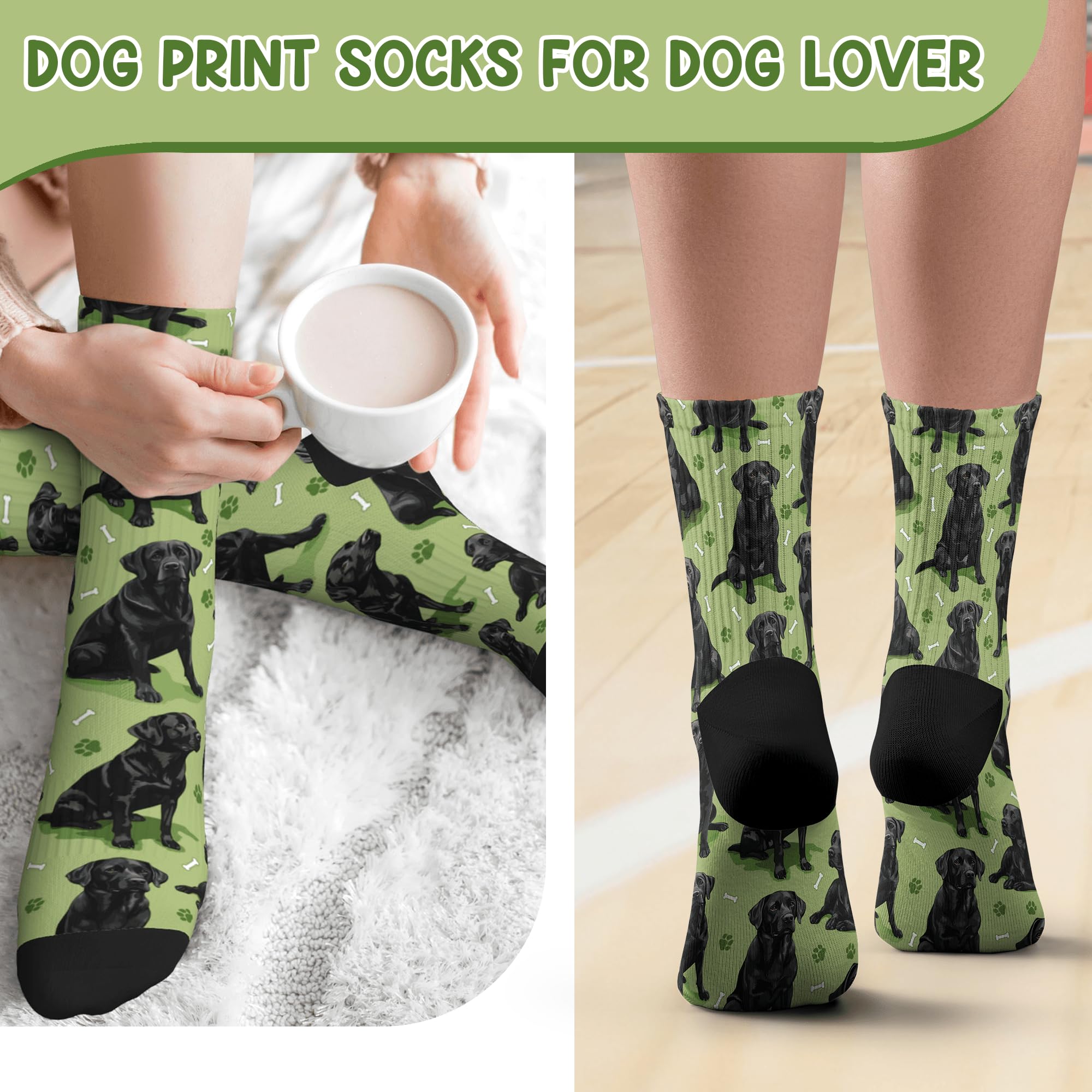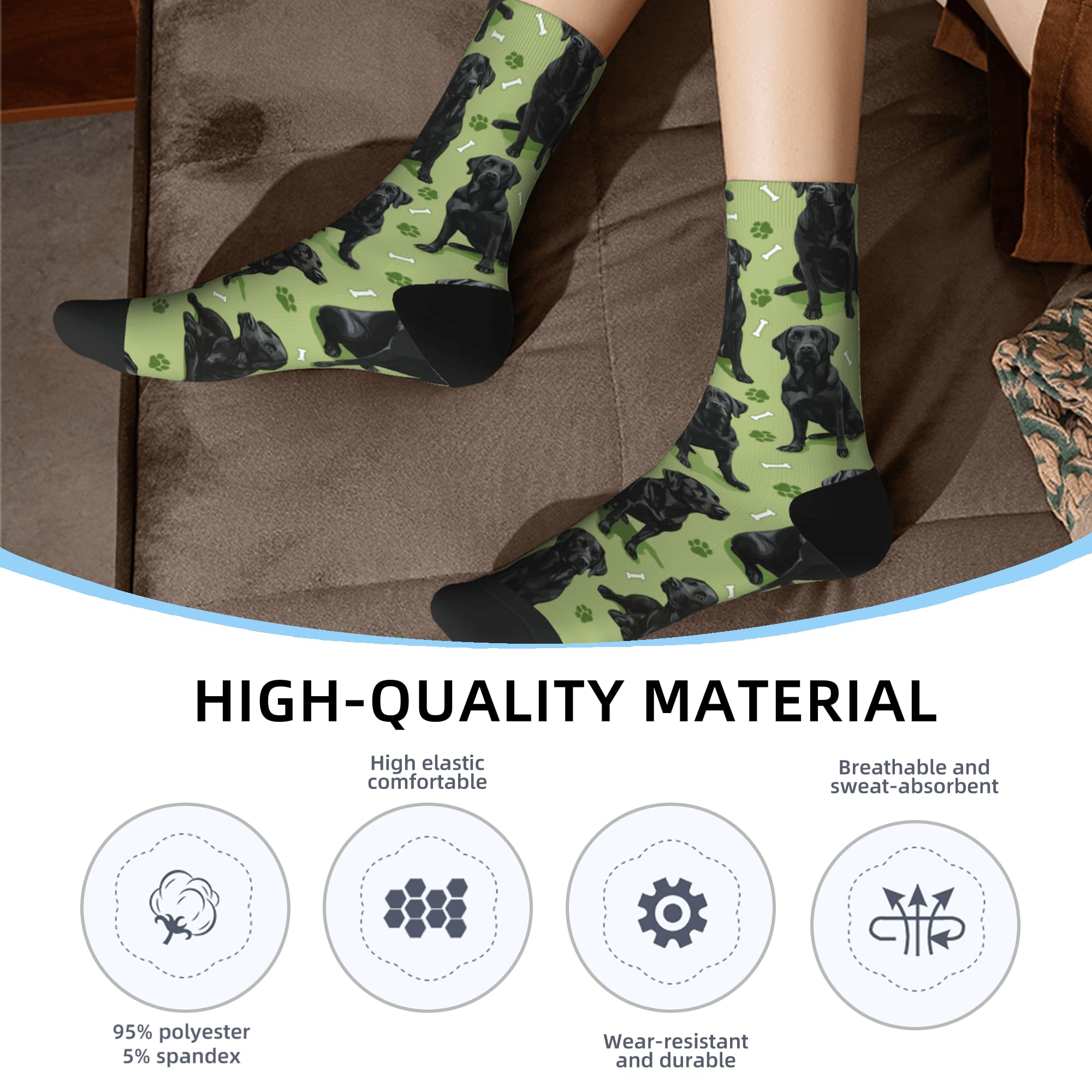 QUALITY MATERIAL: Our dog print socks are designed with a comfortable composition of 90% Polyester and 10% spandex for a flexible fit. They won't fade and are machine washable.