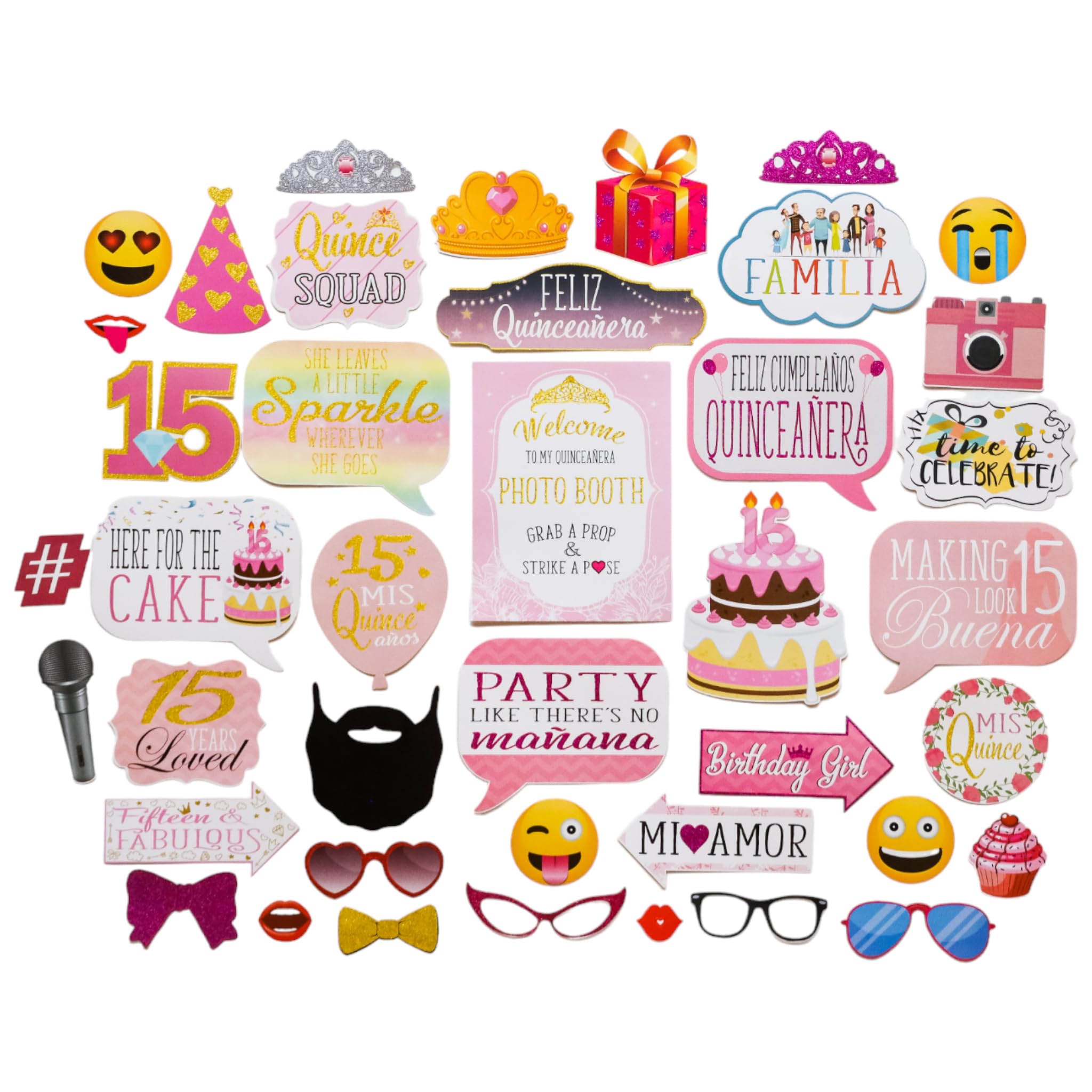 Get the Perfect QuinceaƱera Selfies: These funny Quinceanera birthday photo props are the perfect addition to your 15th bday party. Includes 40 props, one 8x10" sign, 60 adhesive pads, and 45 sticks.