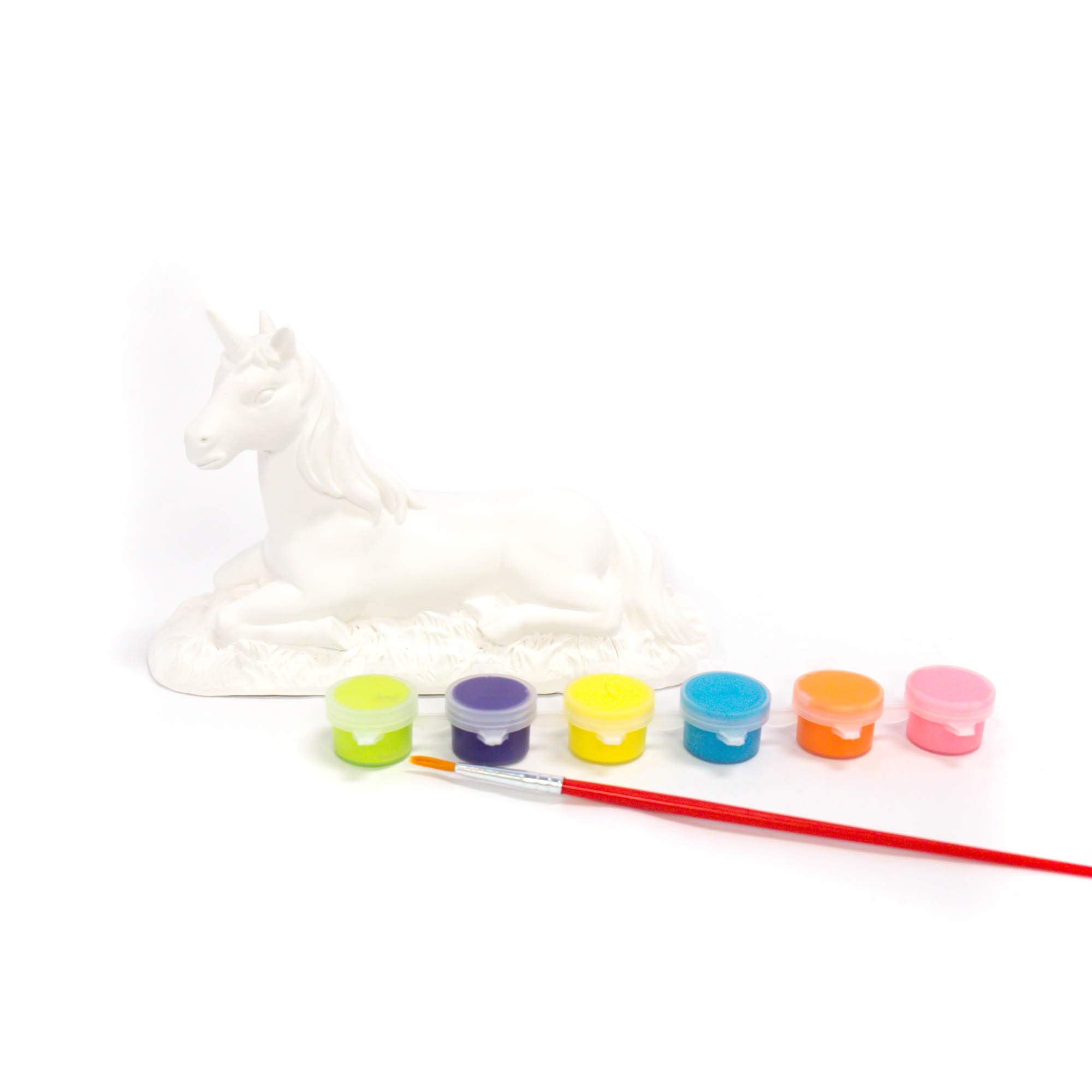KIT INCLUDES: 1 Ceramic Unicorn (6.1 in. x 2.0 in. x 3.8.), 1 Acrylic Paint Strip (Lime Green, Orange, Yellow, Purple, Pink, Blue, 2.2mL each), 1 Paint Brush