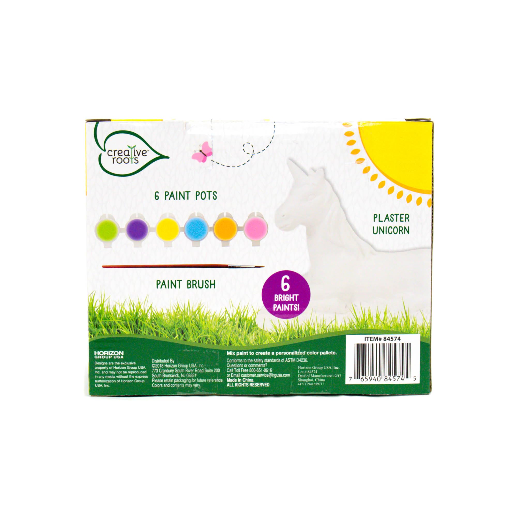 Find the magic right in your own backyard! Express your creativity through color, patterns, and one-of-a-kind designs with the Creative Roots Paint Your Own Unicorn! This adorable set includes a ready-to-paint 6-inch ceramic unicorn, 6 vibrant acrylic paint colors, and a paintbrush to make the unicorn of your dreams come to life. Jump right in and start creating with this ready-to-use kit, no extra prep needed! Use the included paintbrush to design your own color patterns and decorative detail on the magical unicorn. Explore the art of color mixing to create your own palette – what happens when you combine blue with yellow or orange with green?! When you’re finished painting, display your unicorn on a shelf, in an indoor plant, or in an outdoor garden. Be sure to apply an exterior varnish from home to protect your unicorn from the elements! It is for decorative purposes only. Whether you’re looking for a fun staycation activity or an outdoor, screen-free idea, this DIY paint-your-own unicorn is a perfect choice. Recommended for artists ages 5 and up.