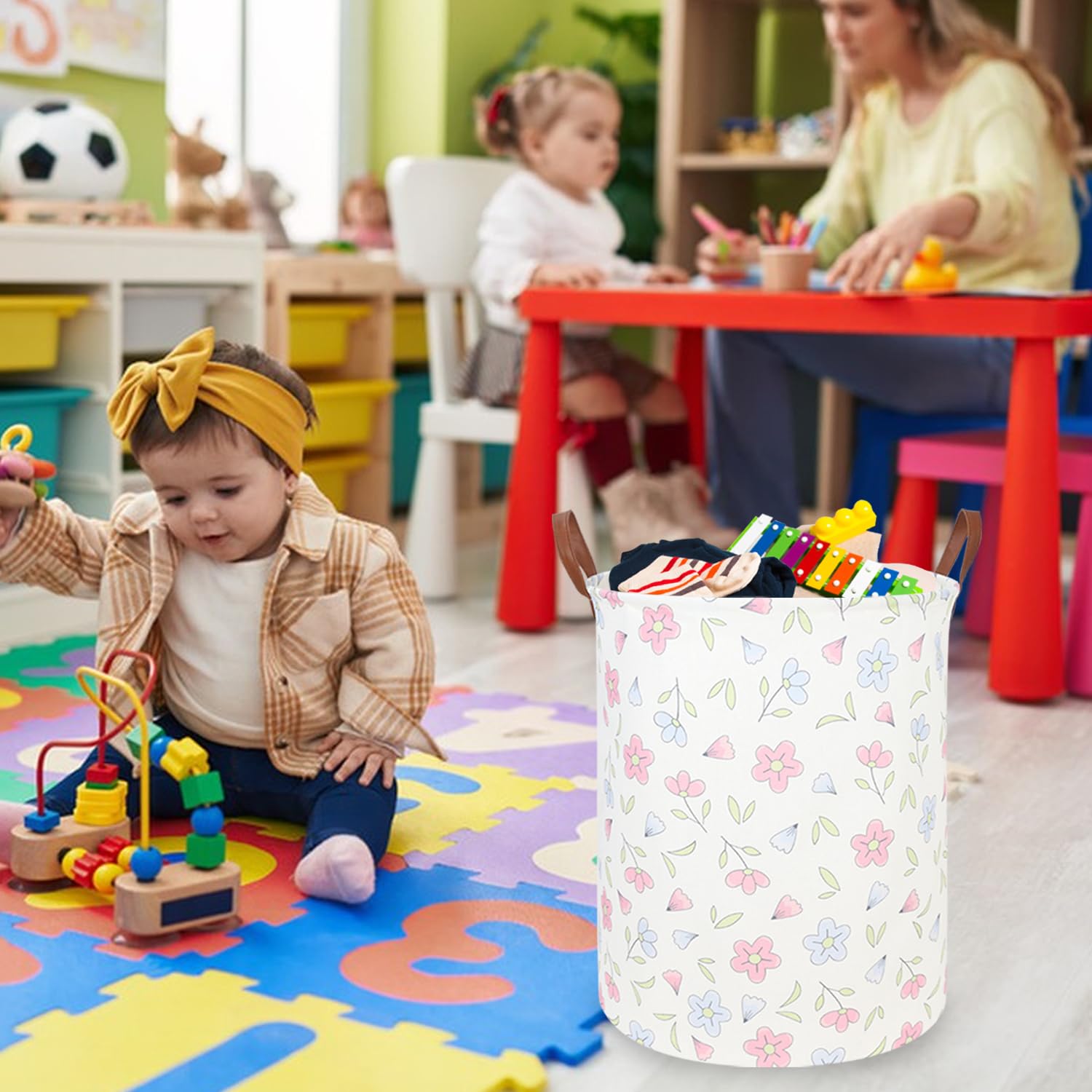 ❀{MATERIAL}:High quality cotton linen canvas (suitable for kids' clothes and toys) + lined with waterproof PE coating (easy to clean) +leather handle (lightweight and portable). Light and practical, easy to carry and store, necessary for home!