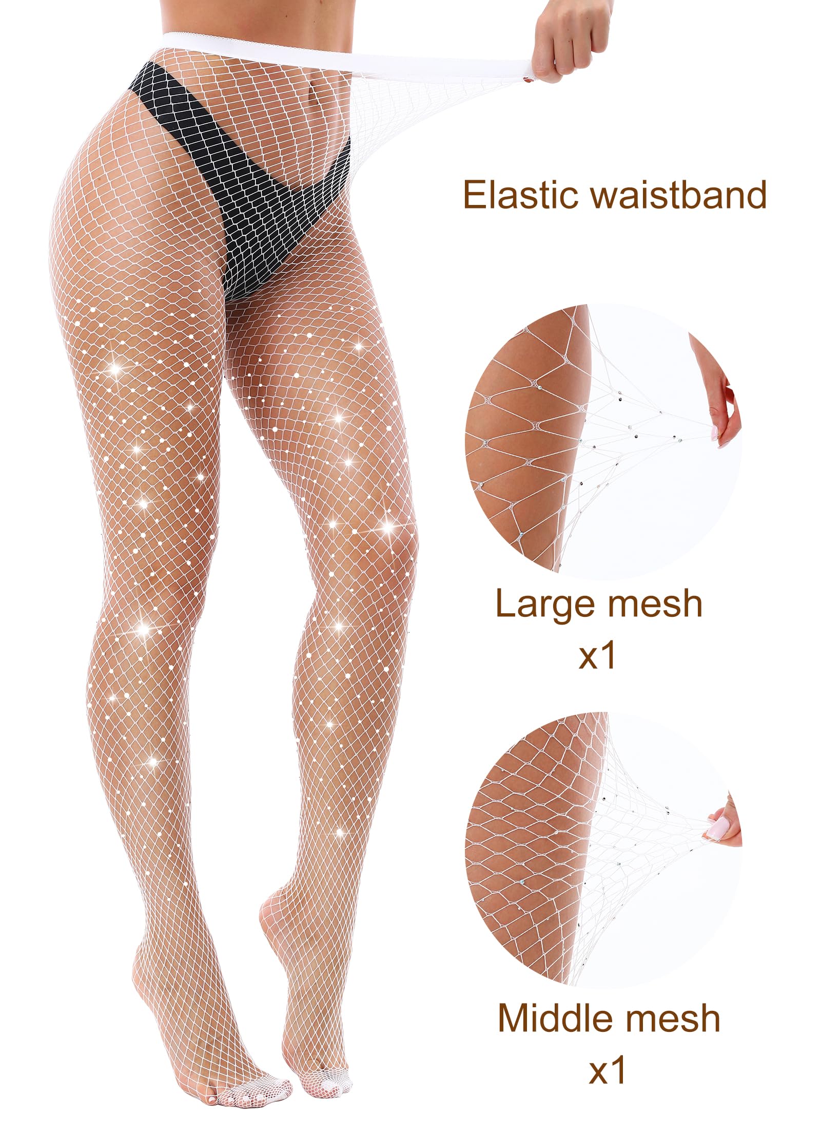 Package Include: 2 Pairs of high waist sparkly white fishnet tights with two types, Large mesh and Middle mesh.