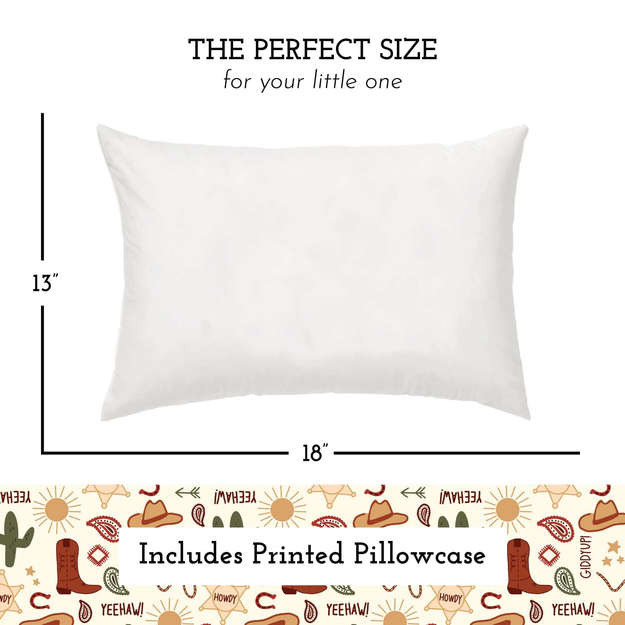 13" x 18" Toddler Pillow and Pillowcase - This snugly, take-it-everywhere he or she goes small pillow is THE perfect size and softness for your toddler! Our children's pillows are just right for their toddler bed too! Available in a variety of colorful designs that appeal to kids, the Little Sleepy Head toddler bedding set ensures sweet dreams wherever they lay their head.