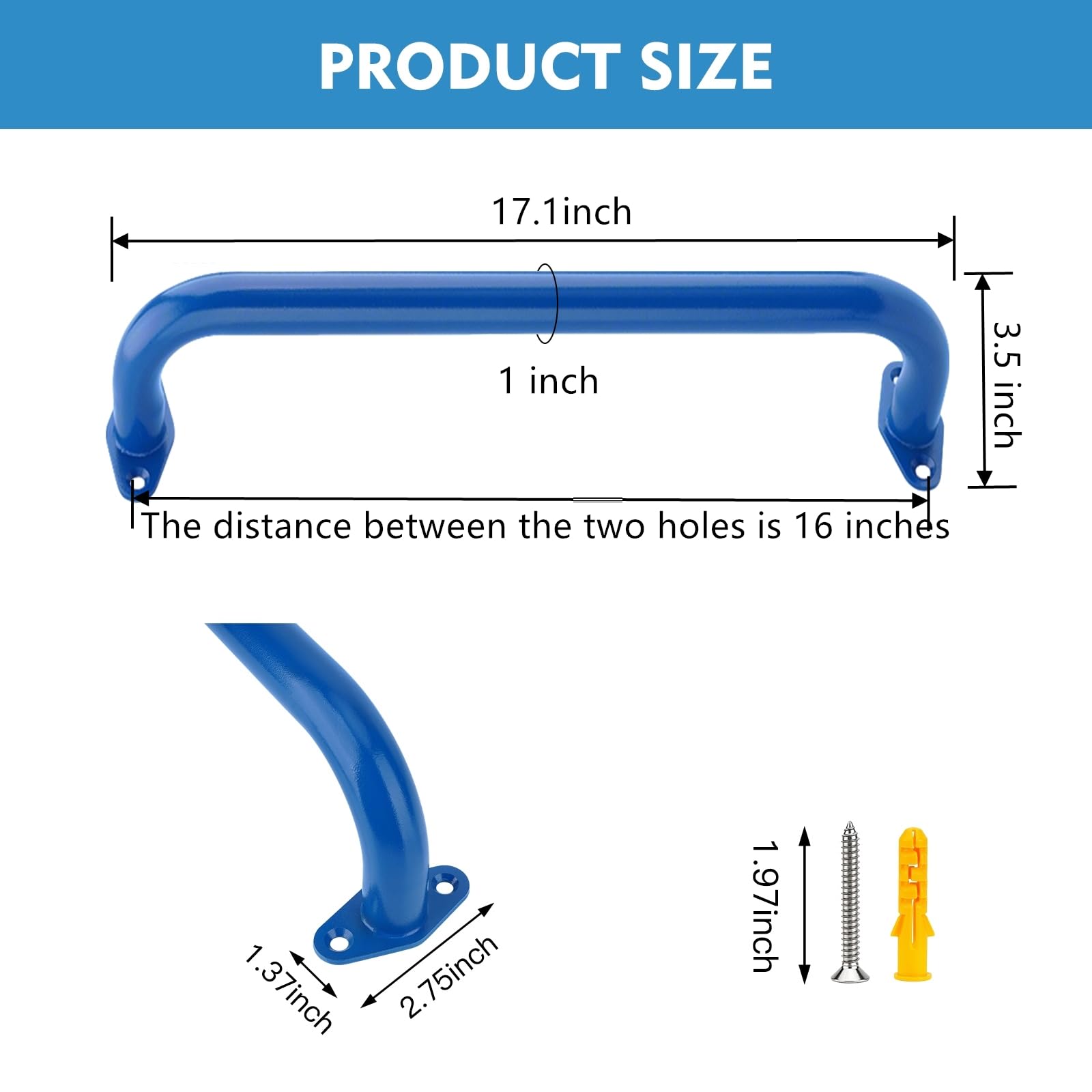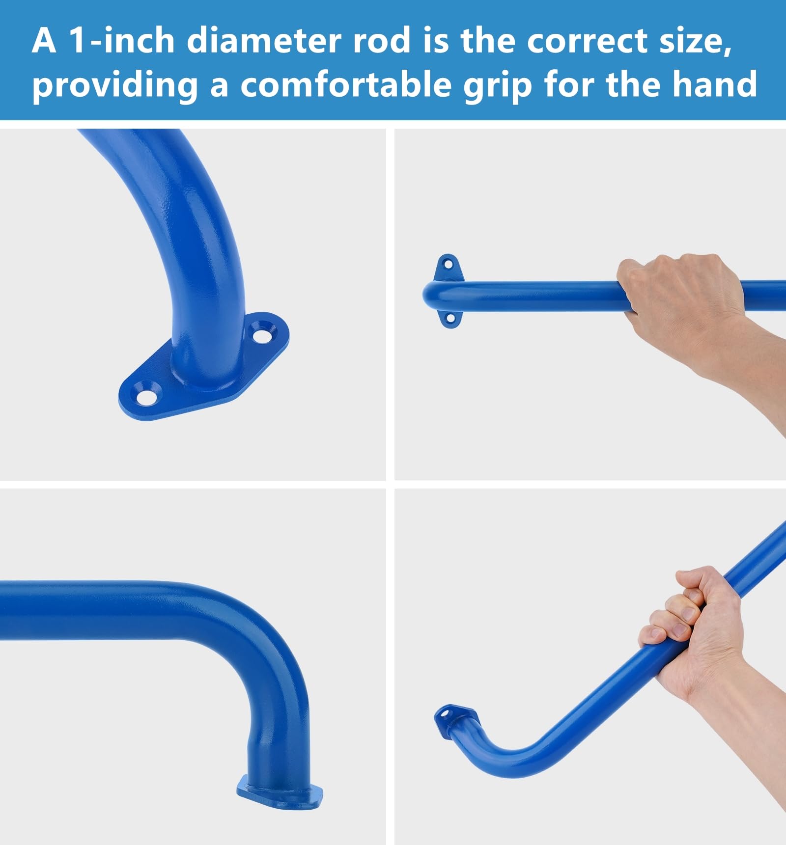 Sturdy monkey bars for backyard kit:The playground handles is made of fully welded steel pipe with heavy-duty steel pipe and 4mm thick metal plate.The surface is coated with matte blue powder, featuring anti-rust, anti-slip and anti-fading properties.The metal handle has two installation holes at each end of the metal plate for installation.It is more stable than a single installation hole