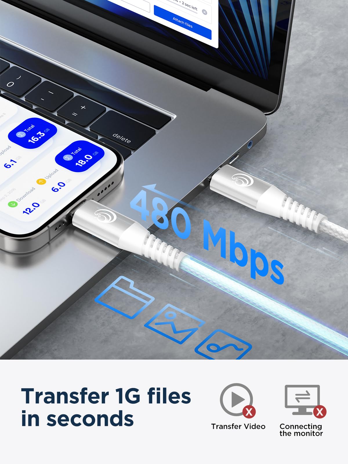 【2024 Upgraded 100W/5A Fast Charging】Experience the next level of charging! With our lightning-speed 100W usb c to c cable, your iPhone 15 Pro Max reaches a whopping 71% battery in 30 minutes, fast charging MacBook Pro 16" up to 50%, also charge Samsung S23 Ultra to 85% while 60W cable is only 54%, notably knocks off 45mins of your waiting time. And data transfer speeds up to 480Mbps