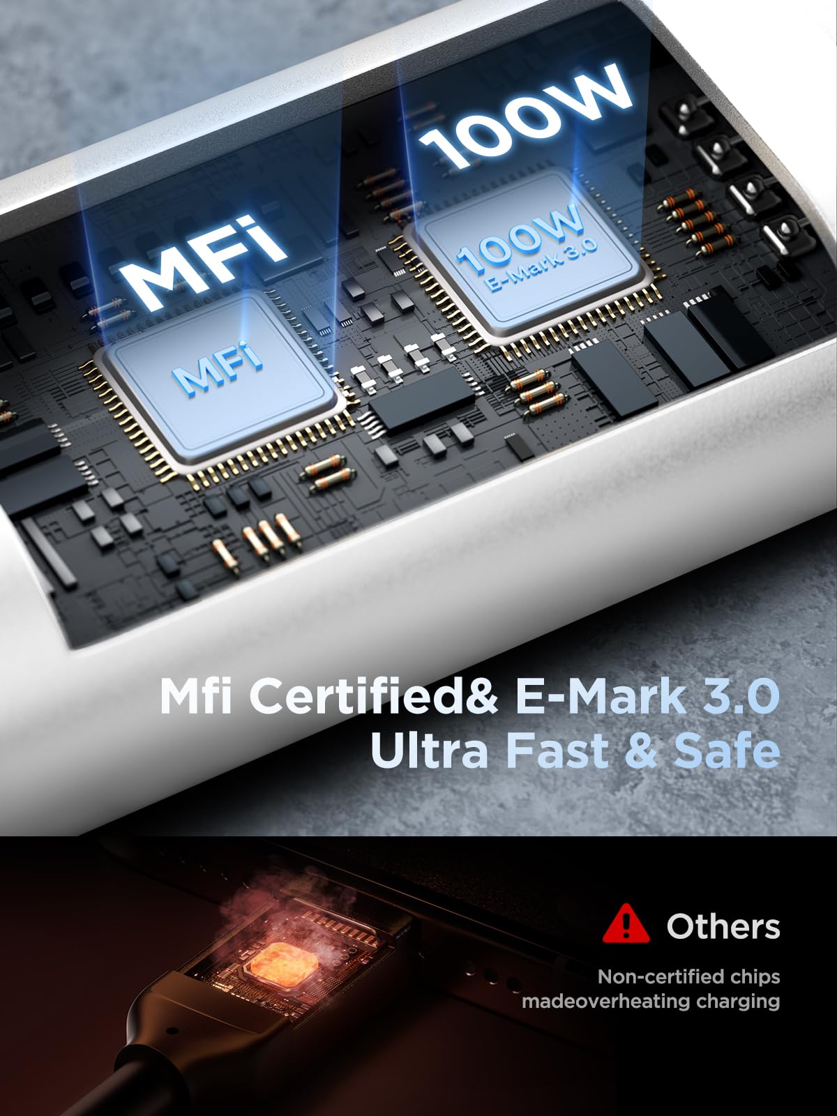 【MFI Certified Emark Chip】Yosou 100W c to c cable fast charging cord is build in the original power delivery E-Mark chip, which supports USB C PD fast charging. Also has passed 48-hour salt spray test ,ROHS,REACH USB-IF, provides comprehensive protection to devices battery and adapters, keep you in light-speed charging and safe