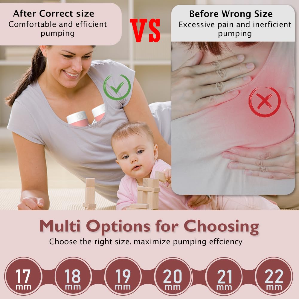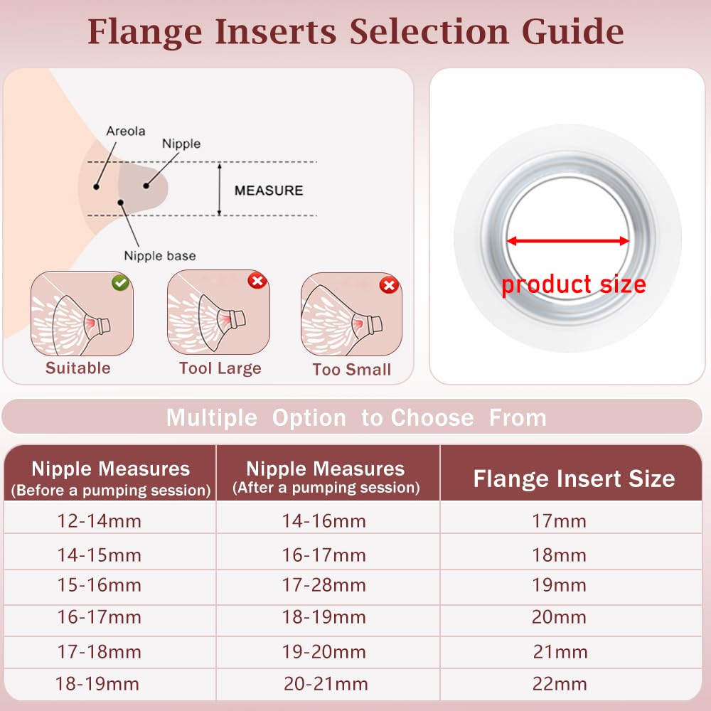 【Multi Option, Choose the Correct Size】: we offer 6 sizes 17/18/19/20/21/21mm for choose, helping you pick a perfect size.The nipple size is different during different breastfeeding periods, it is suggested that moms use a new Flange insert every 1-2 months. The size of the flange insert is very important for comfortable and efficient pumping.