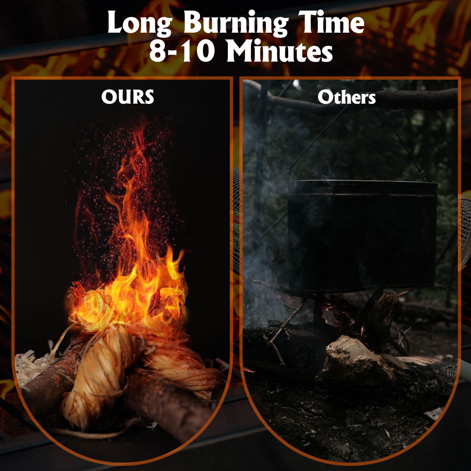 Long Burn Time: Kickstart your fire within minimal time fire starters for wood stove. Every grill starter ensures around 8-10 minutes of burning time. Our fire starters for fireplace produce enough heat to make the fire with one or several pieces.