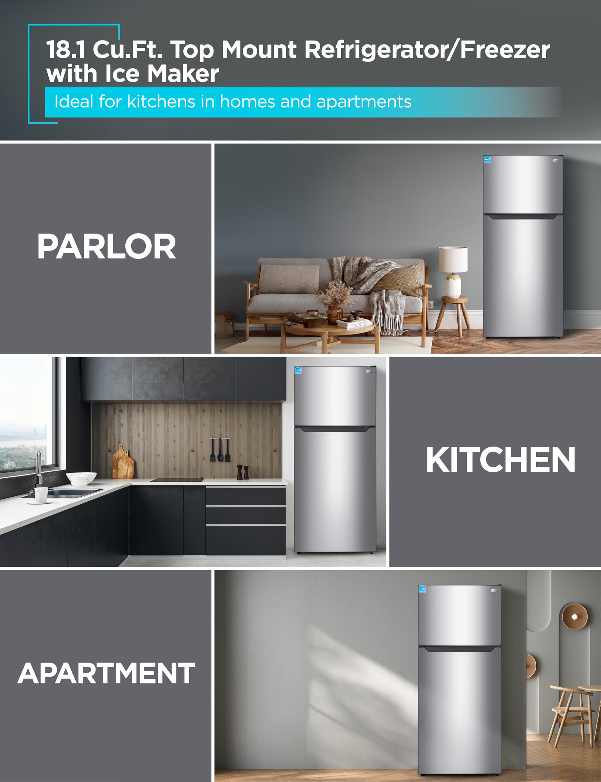 Spacious 18.1 Cu. Ft. Capacity: This full size refrigerator with freezer provides ample space for your fresh and frozen foods. Top freezer refrigerator is ideal for kitchens in homes and apartments