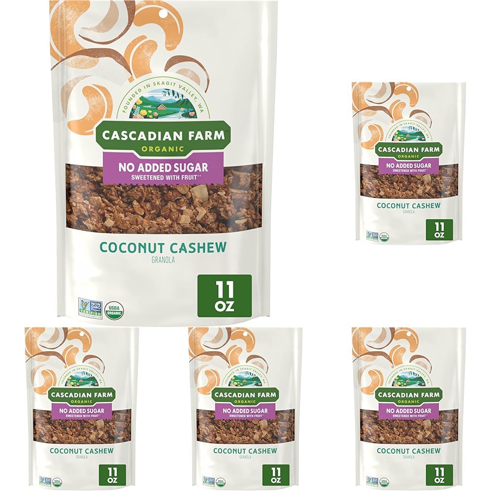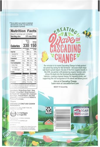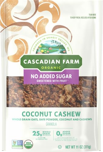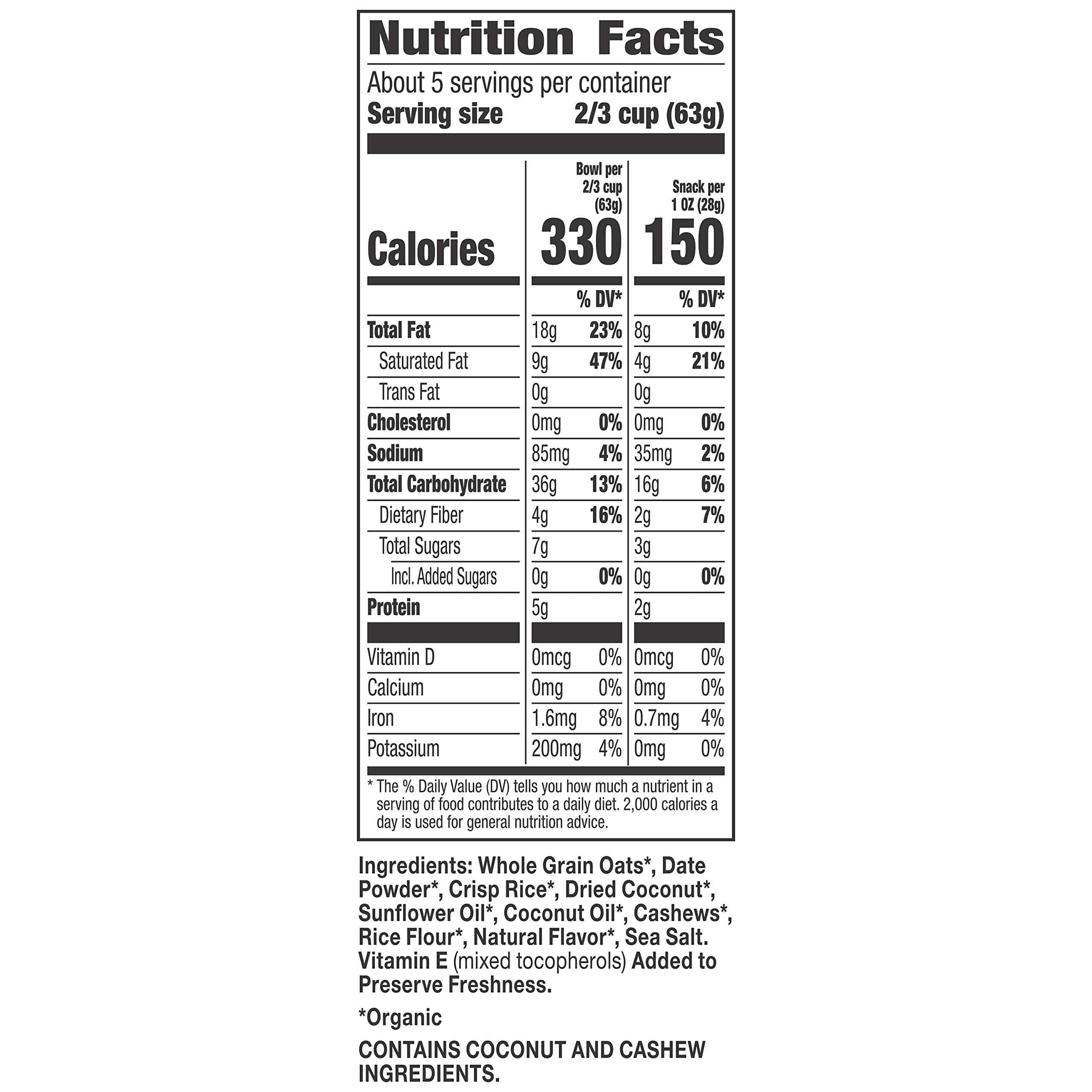 COCONUT CASHEW GRANOLA: Organic granola made with whole-grain oats, date powder, coconut and cashews
