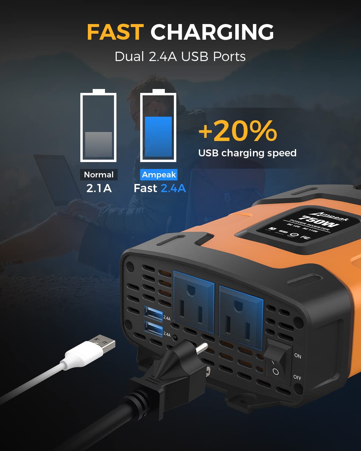 Ampeak 750W Inverter: 750W continuous power (1500W peak), 2 AC outlets, 2 USB ports (2.4A each), and battery cables included—reliable car power inverter 12V DC to 110V AC conversion for your essential devices.