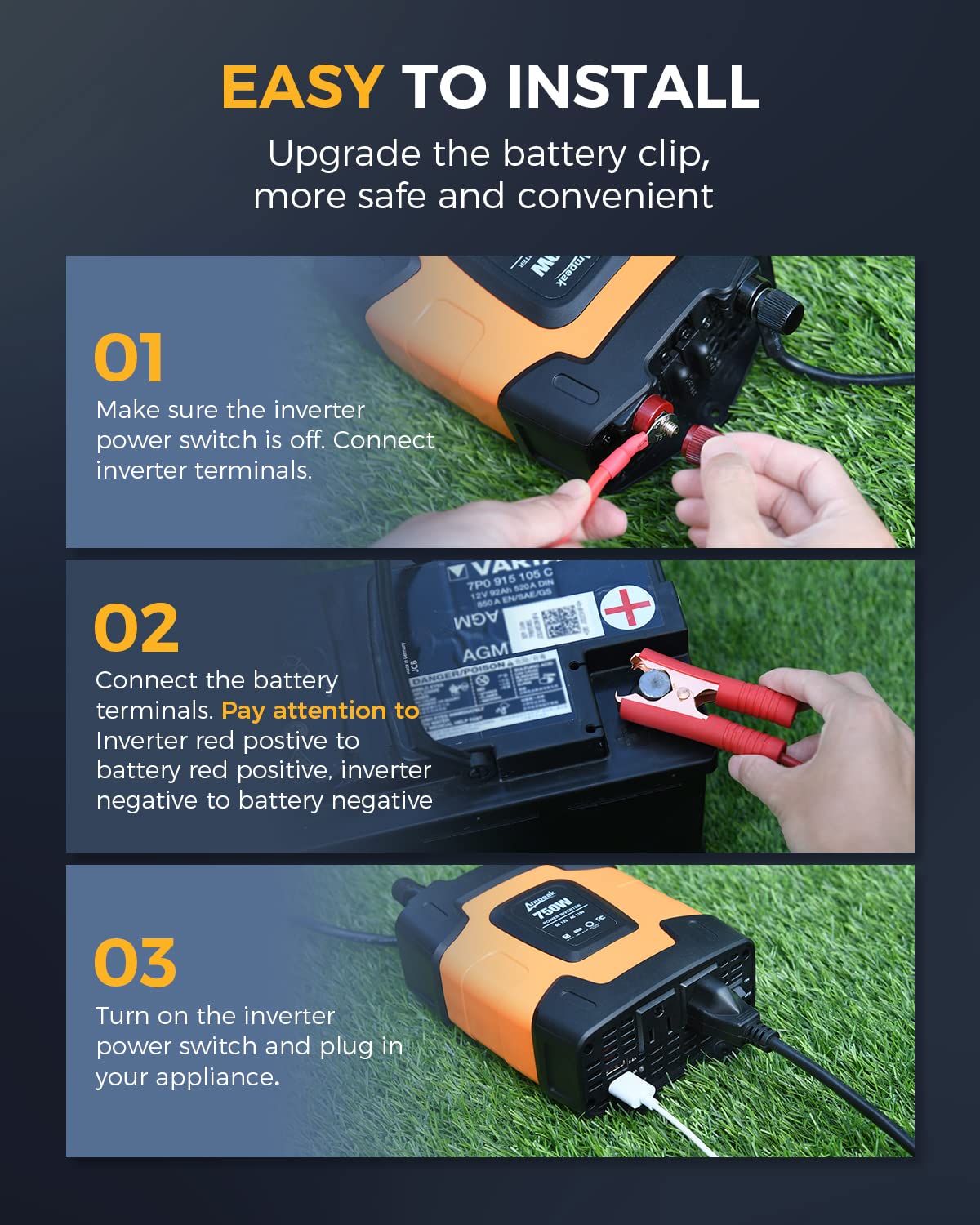 Dual connection option inversor: use Battery Clip Cable for high-power devices (750W continuous, 1500W peak) or Cigarette Lighter Plug for quick, low-power needs,reliable inverter 12v to 110v conversion for cars, RVs, and outdoor essentials.