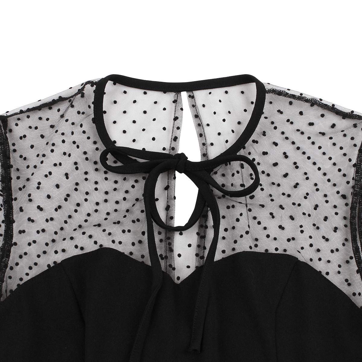 Women vintage 1950s women polka dot lace up cocktail party wedding bridesmaid dress sheer mesh crew neck short sleeve formal prom evening maxi swing midi dresses.