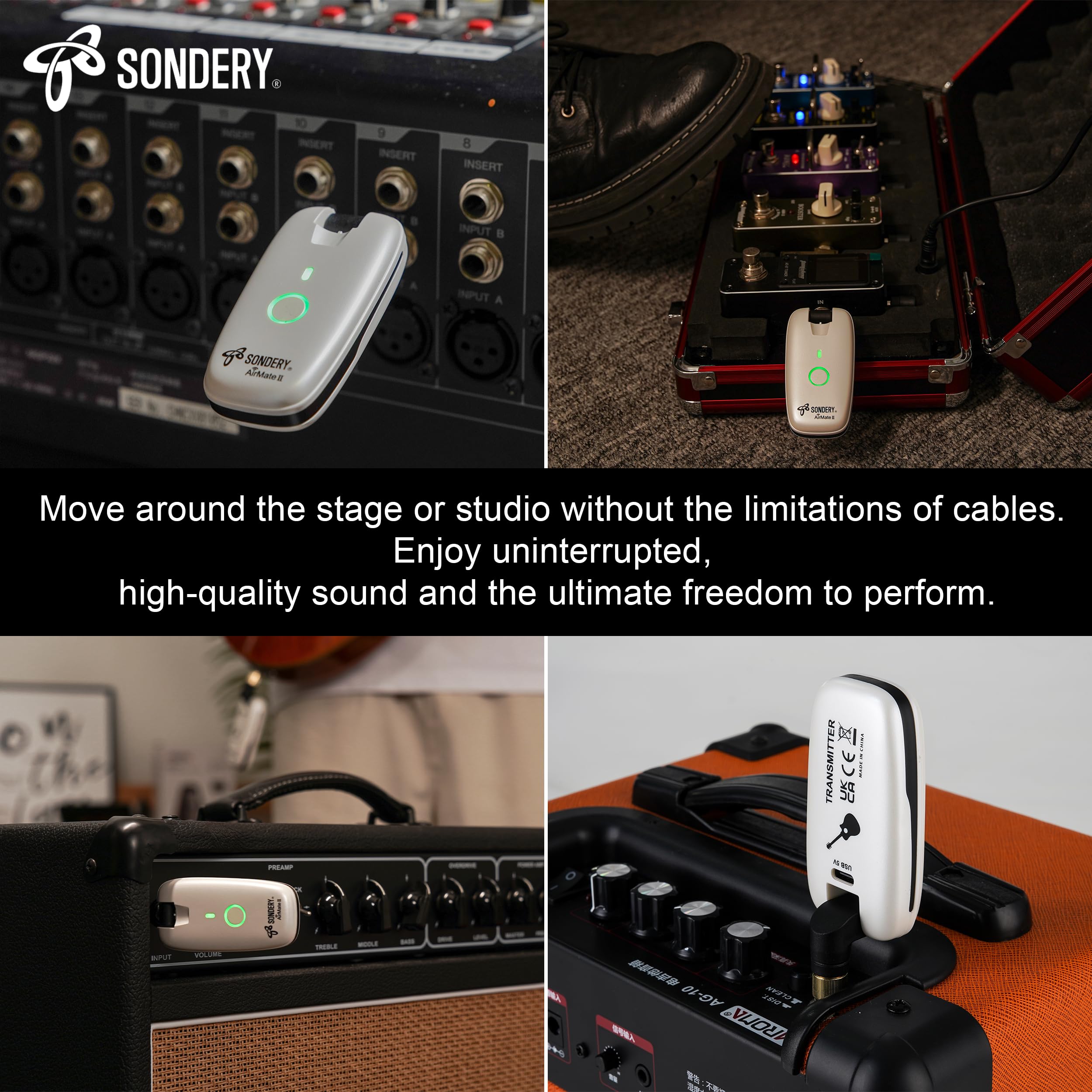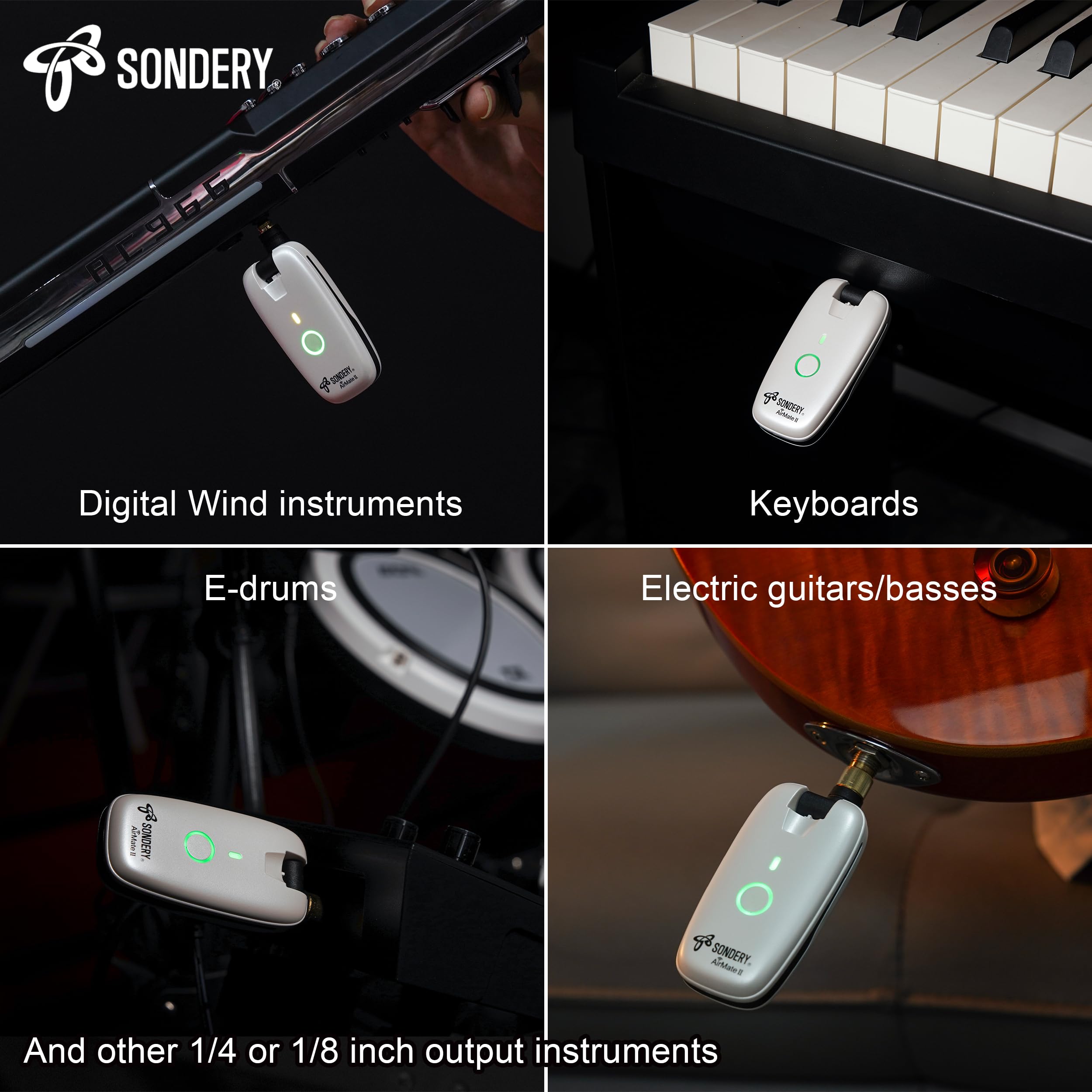 Versatile Compatibility: Equipped with a detachable 6.35mm (1/4 inch) connector and a built-in 3.5mm (1/8 inch) connector, the wireless transmitter and receiver is compatible with a wide range of instruments, including electric guitars, basses, keyboards, and even wind instruments. This universal compatibility means that whether you play an electro-acoustic instrument or other amplified instruments, the AirMate II can seamlessly integrate into your setup. Its versatility makes it an indispensable tool for musicians who play multiple instruments or switch between different types of gear.
