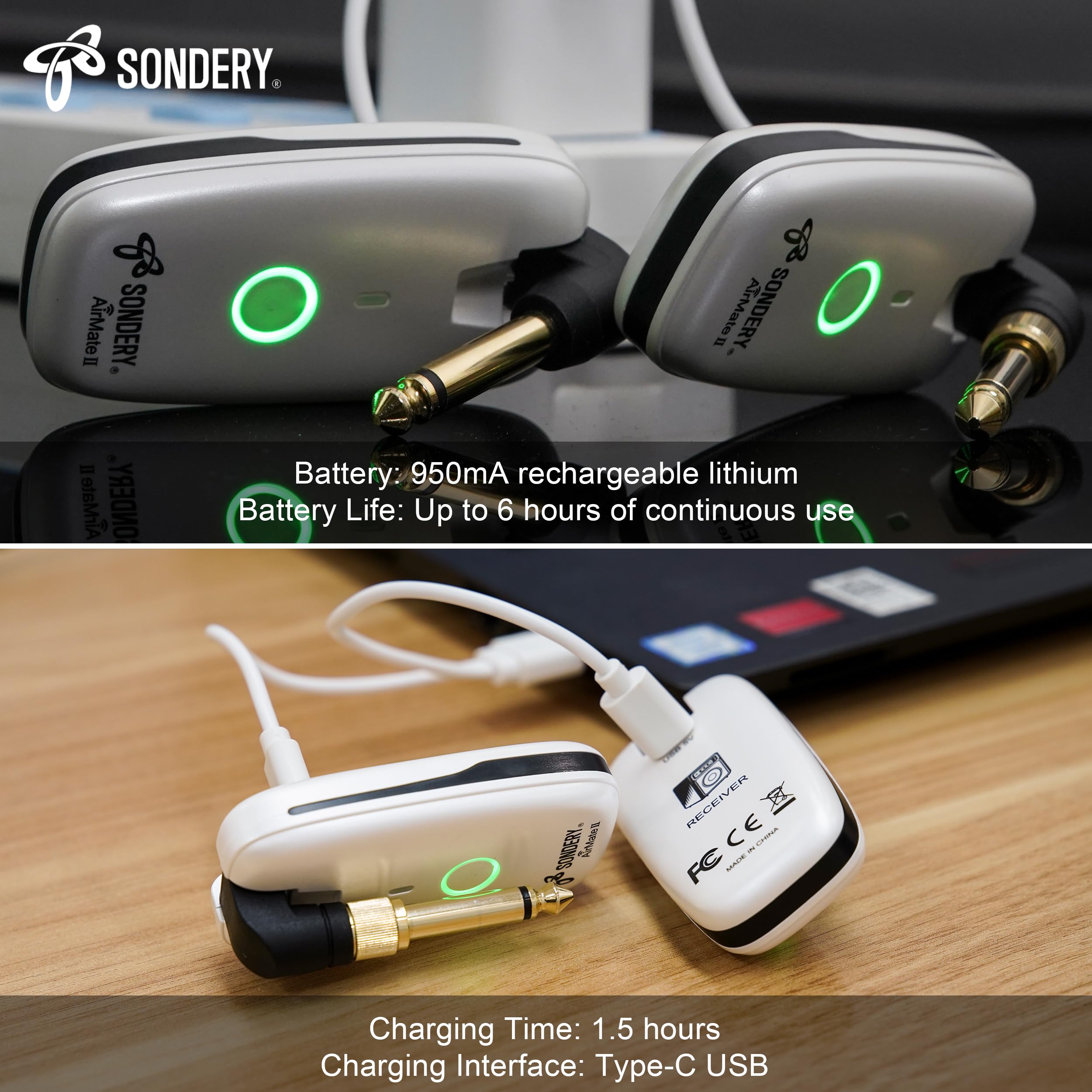Extended Battery Life: Featuring a high-capacity 950mA rechargeable battery, the AirMate II provides up to 6 hours of continuous operation on a single charge. This long-lasting power ensures that your wireless system can handle extended practice sessions and live performances without interruption. The included Type-C USB cable allows for fast and convenient charging from any 5V power source, such as a smartphone adapter, power bank, or computer, so you can quickly recharge and get back to playing. This extended battery life and quick recharge feature make the AirMate II a reliable choice for any musician.