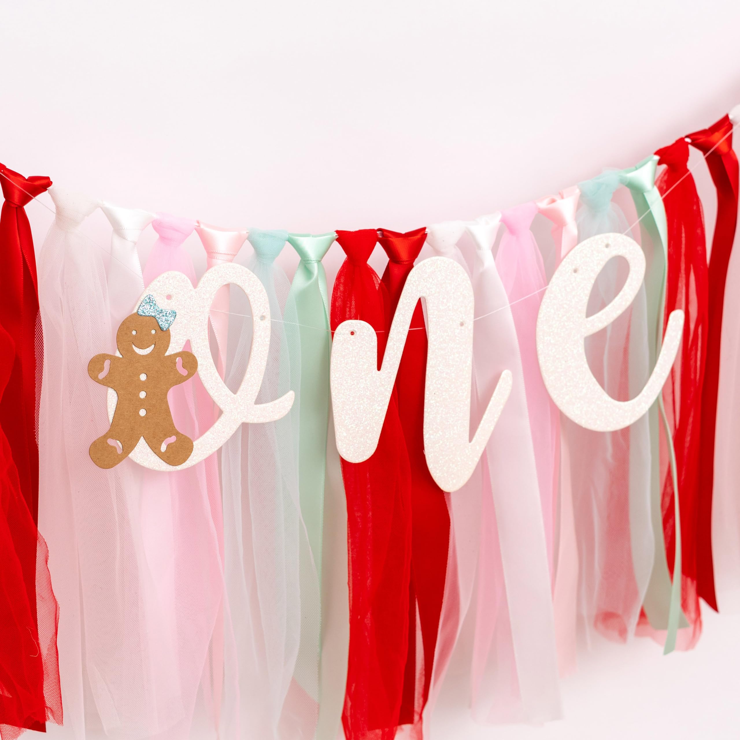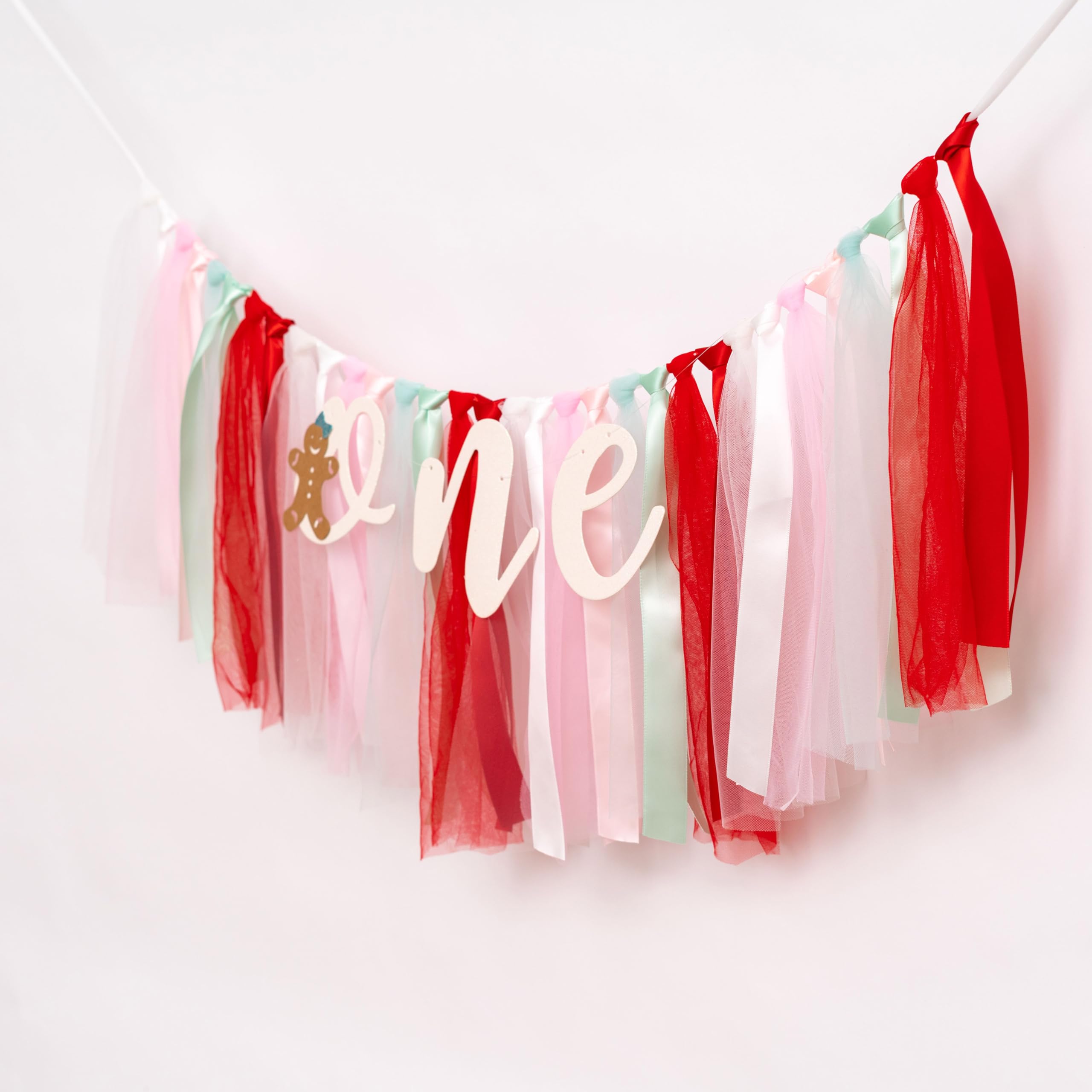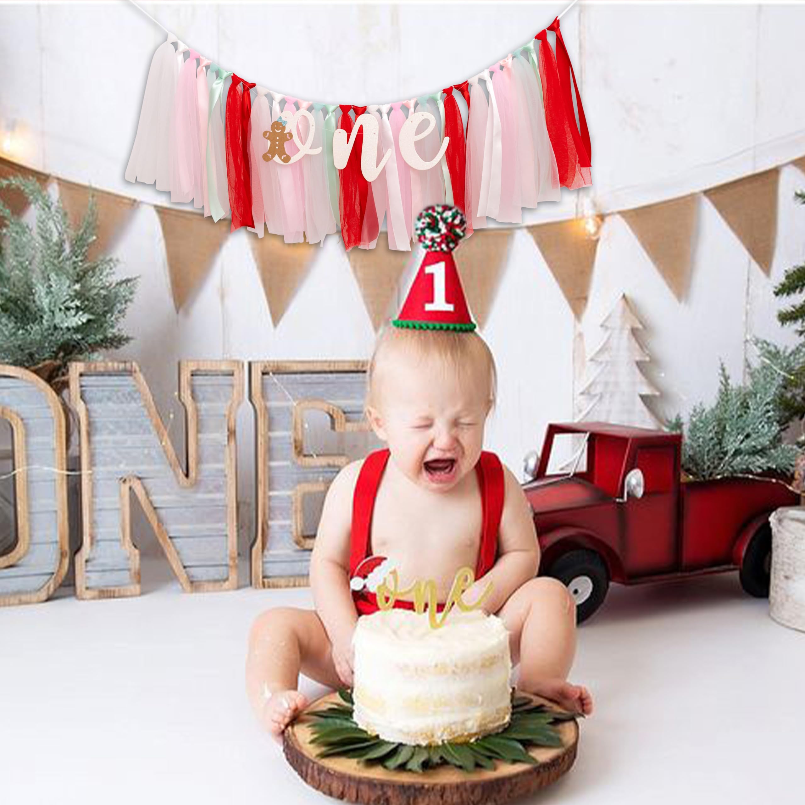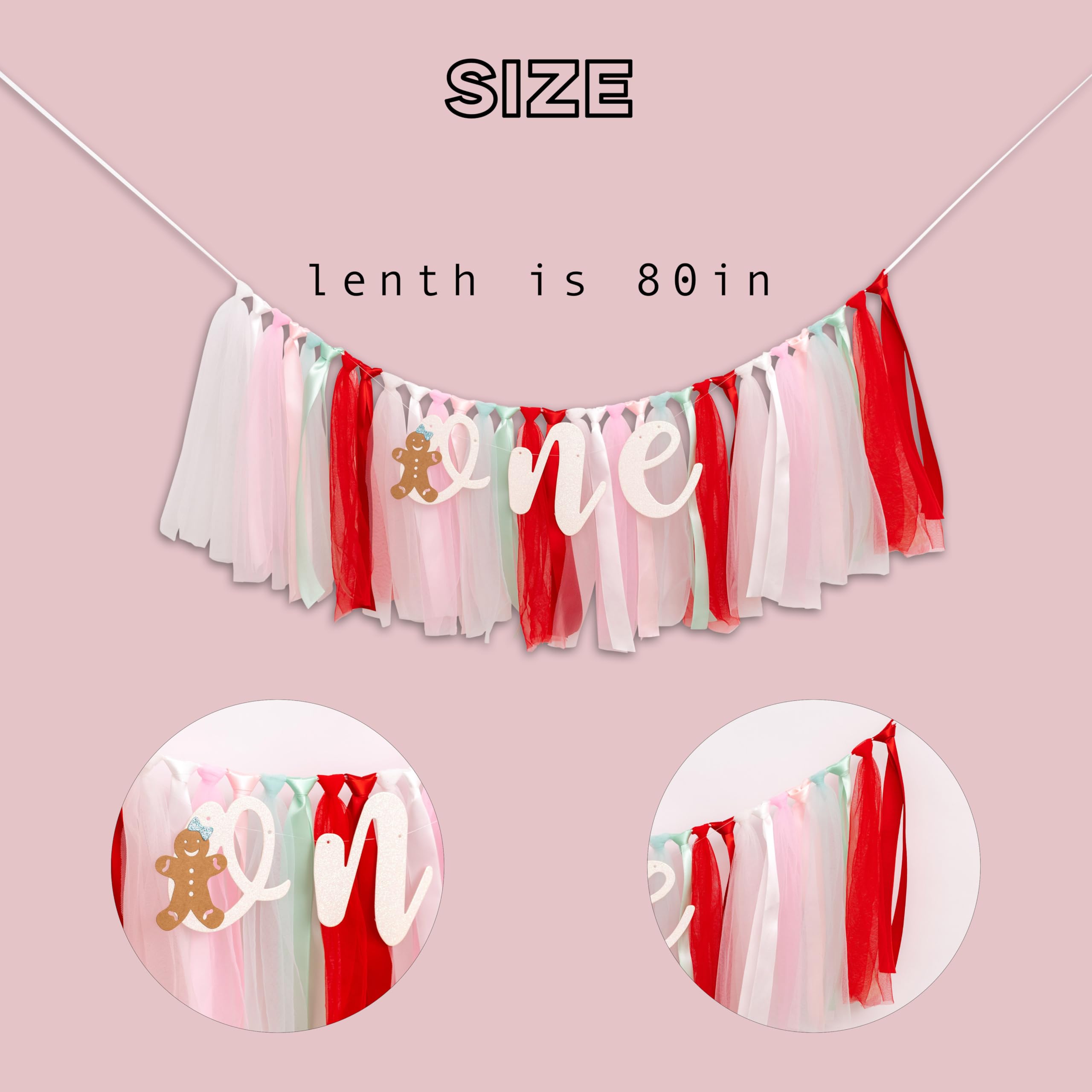 CELEBRATING WINTER WITH A TOUCH OF MAGIC - Elevate your little one's first birthday with this enchanting high chair banner. Adorned with satin ribbons and delicate tulle, the decor features a delightful blend of light pink,candy cane stripe red,green silver, and white hues. Perfect for a winter wonderland or frosty festivity theme, it's a charming touch for your child's special day.