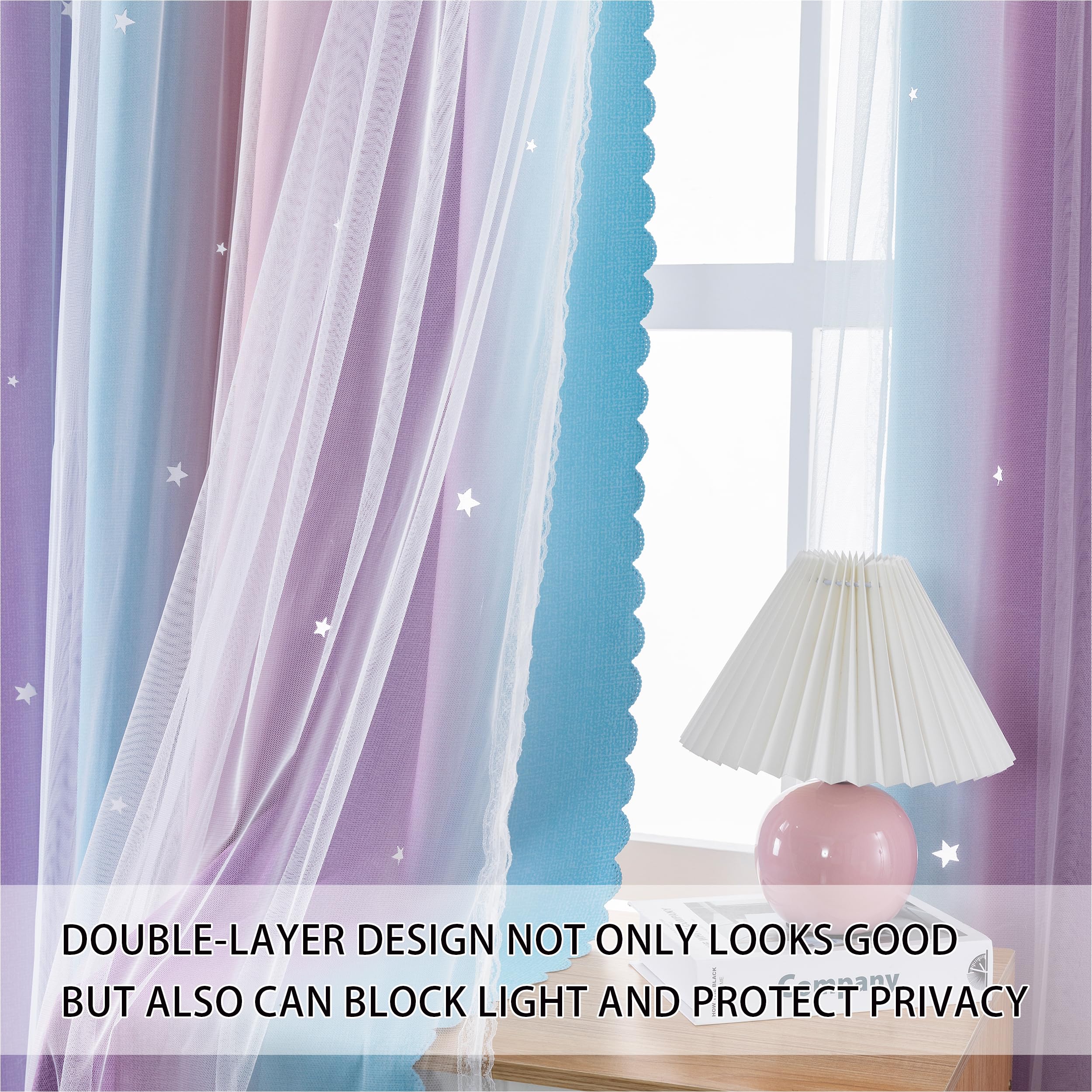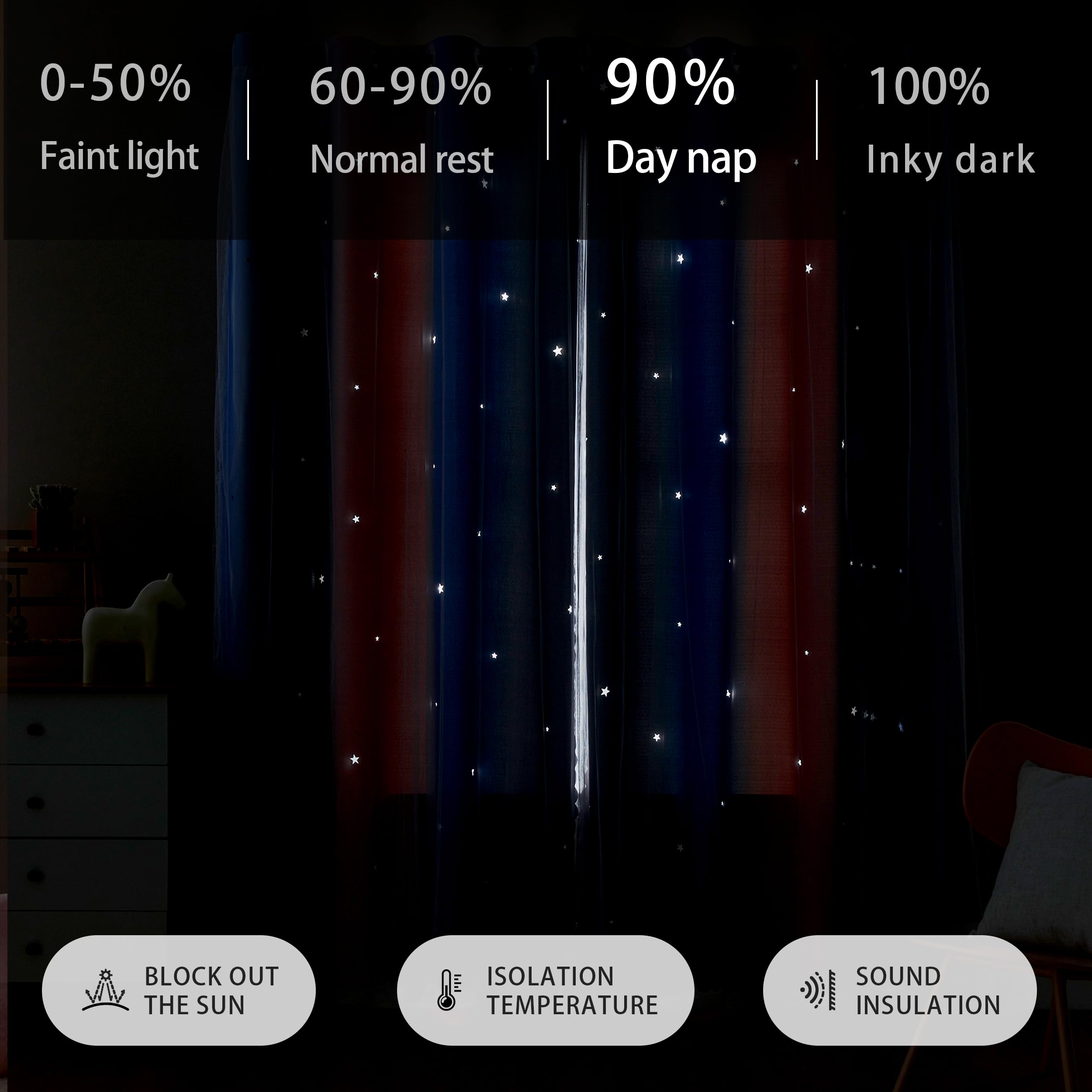 UNIQUE DESIGN: Our kids curtains feature a double-layer design, with the inner layer showcasing printed blackout curtains and the outer layer adorned with tulle. Using cutting-edge laser technology, we intricately cut out stars on the inner curtain. When sunlight filters through, it creates a mesmerizing starry sky effect, perfect for sparking imagination and wonder.