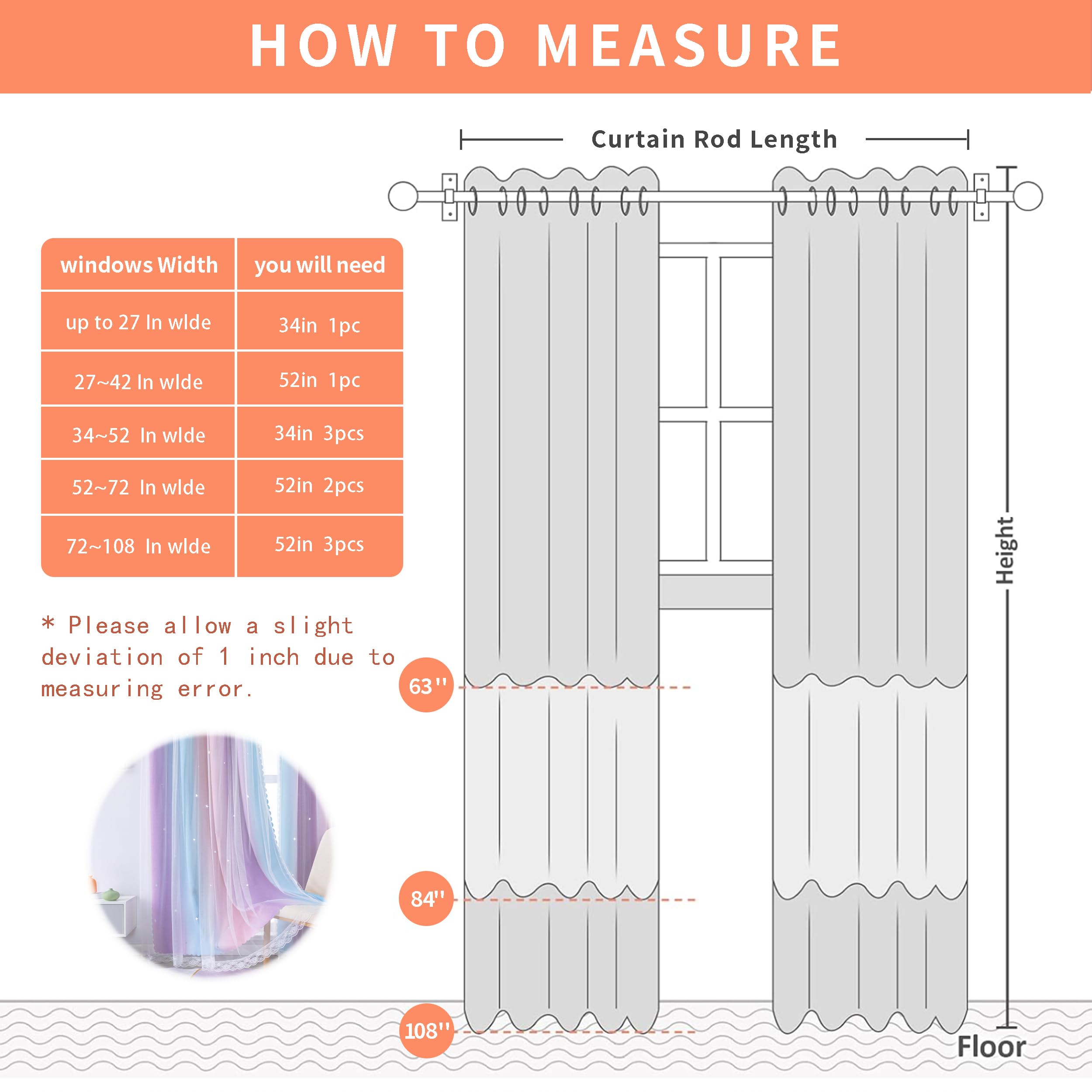 PACKAGE INCLUDES: Each package contains 1 panel accompanied by 1 tie and 3 bows. The panel features a dual-layer design, comprising a sheer curtain and a printed blackout curtain adorned with laser-cut stars. With 8 grommets on top, each panel is designed to effortlessly fit most standard rods.