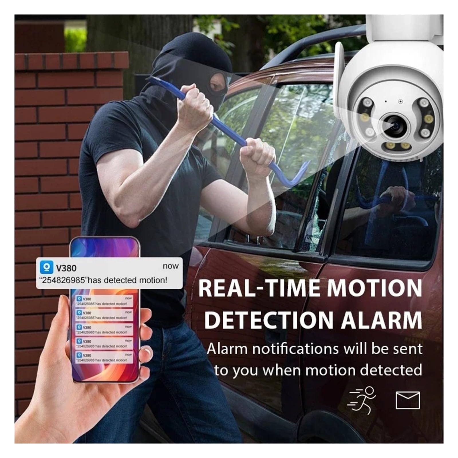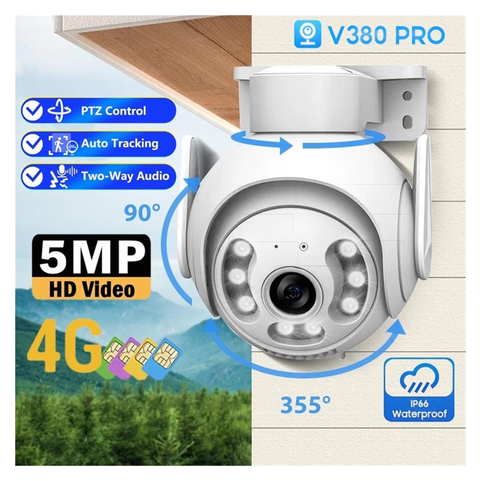 Packaging includes: 1 x camera 1 x User Manual 1 x power adapter 1 x waterproof cap 1 x installation screw package ========== Zoom type: Digital zoom Zoom: 10 times Number of lenses: Single lens AI function: Motion detection Shell material: Plastic Color night vision: Yes Operating temperature: -10° C to 60° C IP rating: IP66 Power supply mode: Municipal power supply Rechargeable battery: None Scene: Indoor and outdoor Range of movement (tilt) : Others Movement range (translation) : 0°-360° Megapixels: 5 million pixels TF card: None Power supply: Normal Internal storage: 128G Installation methods: Wall-mounted, hanging Colour: White is_customized: No Audio output: Bidirectional audio Minimum illuminance (Lux) : 0.01 Lux Perspective: 80° Video compression formats: H.264, H.265 Red light distance (m): 10-15 meters Power supply (V): 12V Alarm action: Local alarm Power consumption (W): 2A Features: Waterproof/weatherproof Sensor: CMOS Model: 2 million / 5 million WIFI camera Lens (mm) : 4mm Connection: 4G High definition: 5 million pixels Style: Bullet Camera APP: V380 Pro Resolution: 5 million pixels high definition Network connection: 4G SIM card, RJ45 network port Alarm: Action detection and image push, artificial intelligence intrusion detection Storage: TF card up to 128G, cloud storage (optional) Night vision: The distance between red lights is 10 to 15 meters Waterproof: IP66, support Usage scenarios: indoor and outdoor Digital zoom: 10x 4G version: Supports 4G sim card, no need to connect to WIFI. 4 g spectrum: only supports the following 4 g band: B1 / B3, B5 / B8 / B38 / B39 / B40 / B41 "Welcome to Security Vision Store" ✅ 10K ultra-high definition / four-lens panoramic / AI tracking camera coverage, from home security to commercial surve