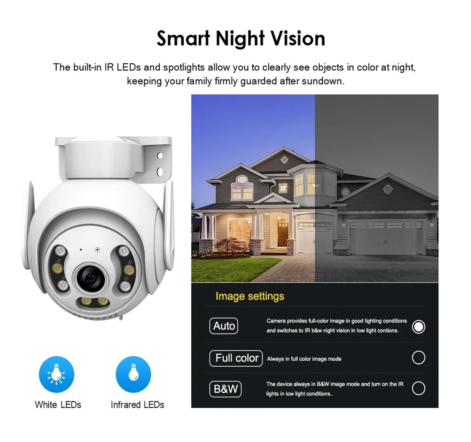 【30-meter Infrared Night Vision + Full-color Mode】 : Built-in infrared fill light, night vision distance up to 30 meters, supports full-color night vision mode, intelligently switches between day and night images, and night monitoring remains clear and bright.