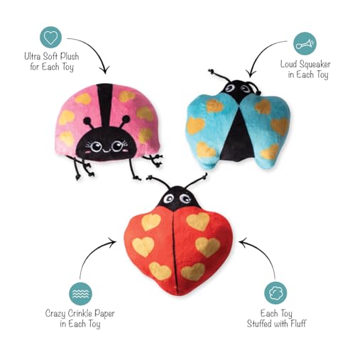 Bugs and Kisses! PetShop by Fringe Studio's “Buggy for You” 3 piece mini plush toy set is perfect for the pup that likes to play all day. Made with a loud squeaker and crazy crinkle paper in each toy, this trio is sure to be your pups best bugs forever. Great for small dogs and not intended for aggressive chewers.