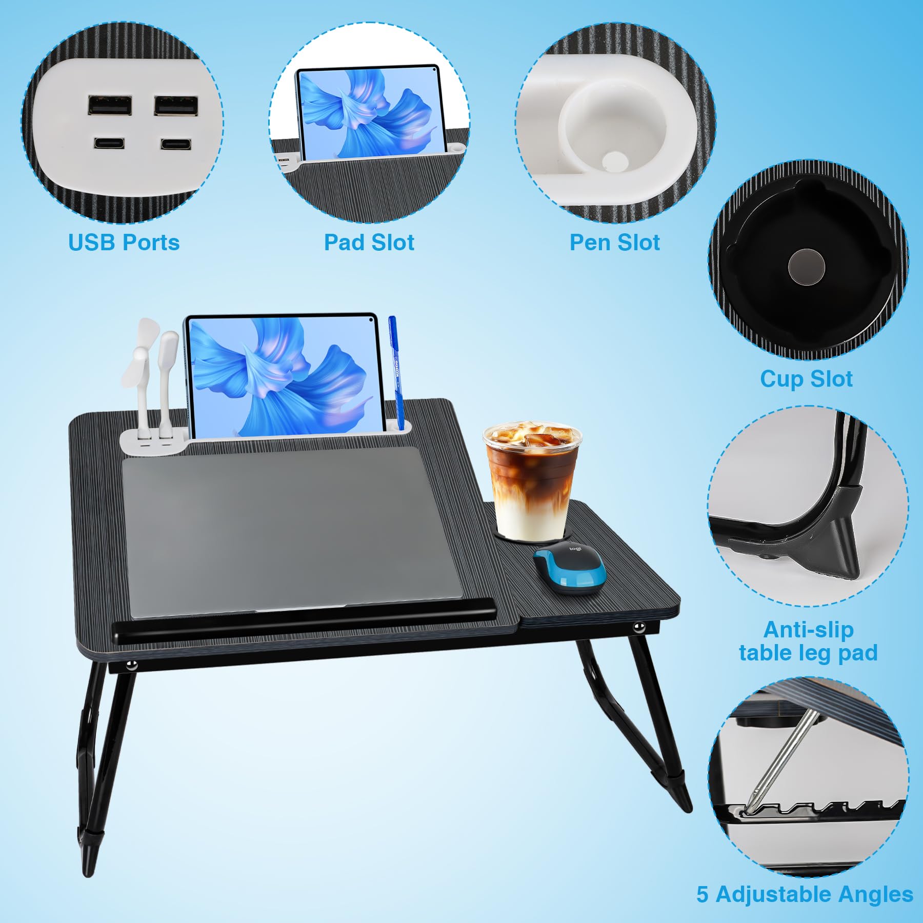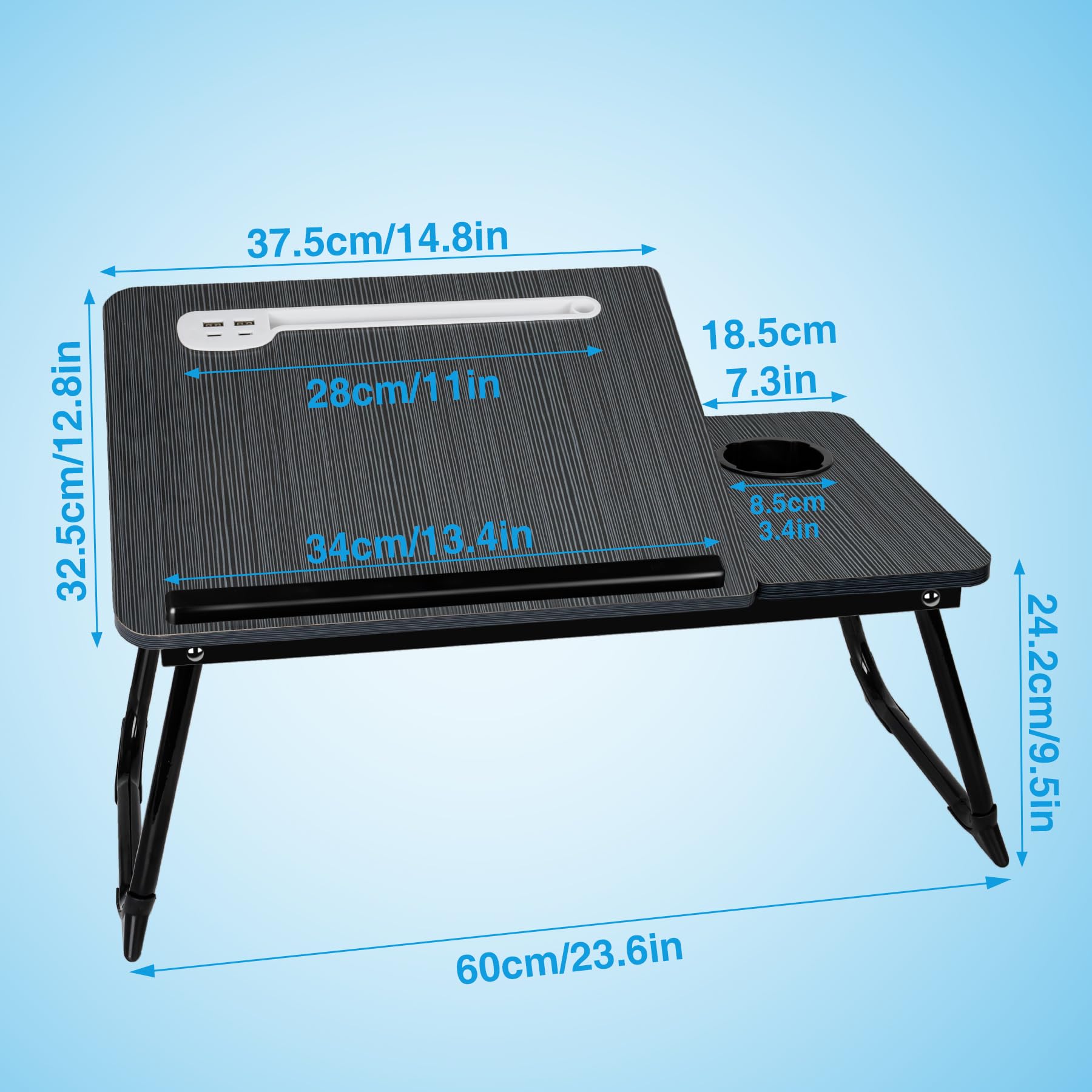 CSYY Adjusatable Laptop Desk USB Bed Table Lap Desk, Foldable Laptop Bed Tray, Lap Desk Portable Notebook Stand with USB Port, Desktop Card Slot, Cup Slot for Couch Sofa Floor Upgraded Multifunctional Laptop Table Practical Design Nice look in simple and modern design,not only easy to use, but also bring you a good mood. With USB port The usb table can be charged for desk lamp, mobile phone, fans or others, more convenience for your any work. With cup holder The table cup slot design allows your cup to be placed smoothly on the table to keep your favorite drink within reach. With a desktop card slot Holds your iPad, tablet or cell phone. You can watch movies or TV in special slots on your desk. Don't have to hold. It's comfortable and easy. With 5 Adjusatable angle Enough for your all angle to use Smooth Bound The smooth corner of the table can avoid sharp hurt to the customer, as well as the damage caused by the external force to the table. Easy to carry and store Foldable desk legs make it more portable and convenient, you can work everywhere and fold flat for convenient storage,can be carried around in the car, office or on vacation. Non-slip legs design The anti-slip leg pads at the bottom of the table prevents slippage, providing comfort and stability during meals and work. Specification: Material: Solid Wood Particle Board & Alloy Tube Color: Adjustable Black Desktop size: 60cm(L) x 40cm(W) Weight: 2.5 kg Package Included: 1 x folding bed desk 1 x use mini lamp 1 x use mini fan