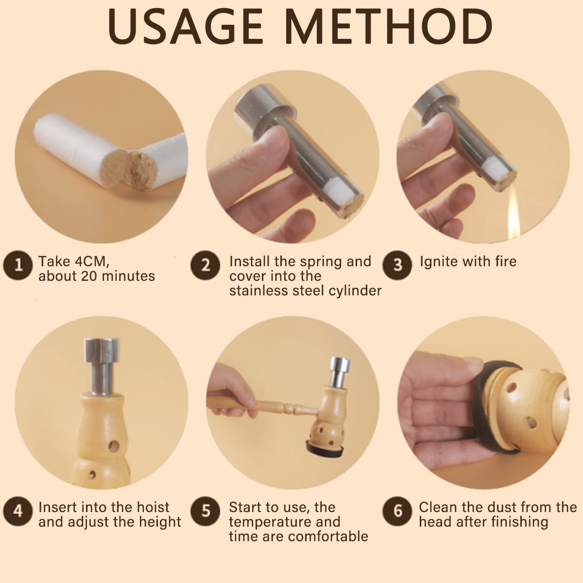 [Upgrade Design]: 1* high quality wooden moxa holder (Moxa stick not included), 1* fire extinguishing cap, 1* silver cylinder to help push the moxa stick, a more complete moxibustion set, so you can use it more comfortably and conveniently. The length of the moxa stick holder is about 9.4inch (24cm). Fits all standard moxa sticks with 0.7" (18mm) diameter moxa rolls. Please make sure there is a space between the lit moxa stick and the mesh to prevent being burned
