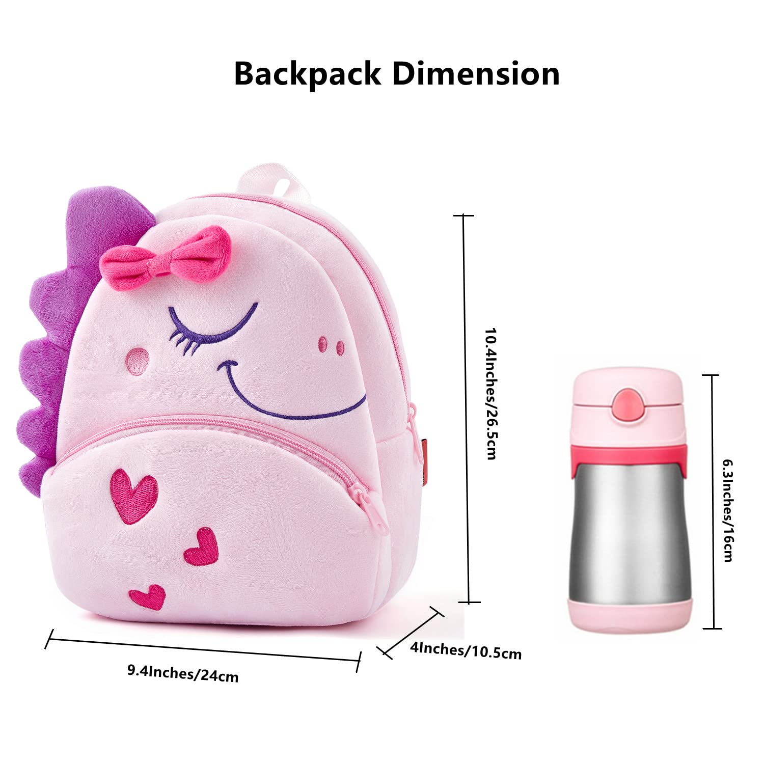 Size: Toddler Bag is 24*10.5*26.5 cm(9.4*4*10.4 inches) in length*width*height; Toddler bag is suitable for baby girl and boy of 2-6 years