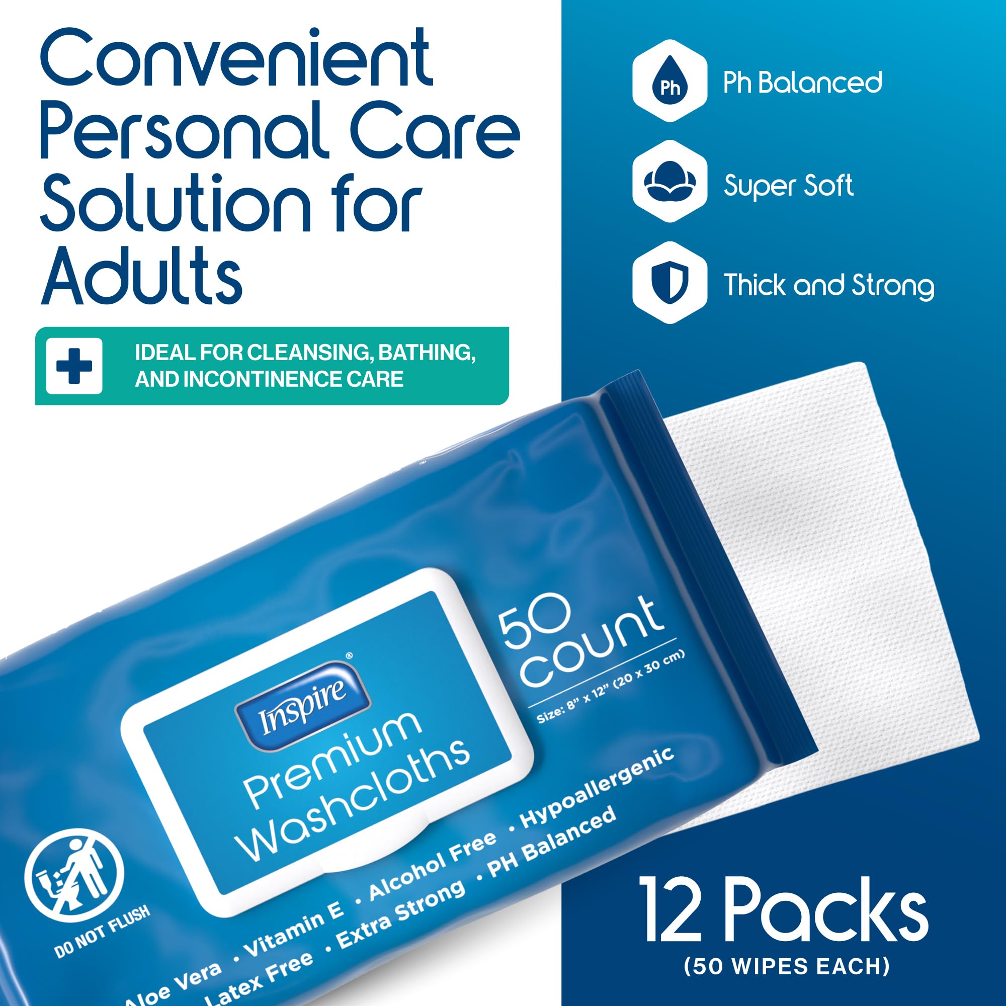 DISPOSABLE WASHCLOTHS FOR ADULTS WITH SOOTHING ALOE VERA AND VITAMIN E: Ideal for cleansing, bathing and incontinence care