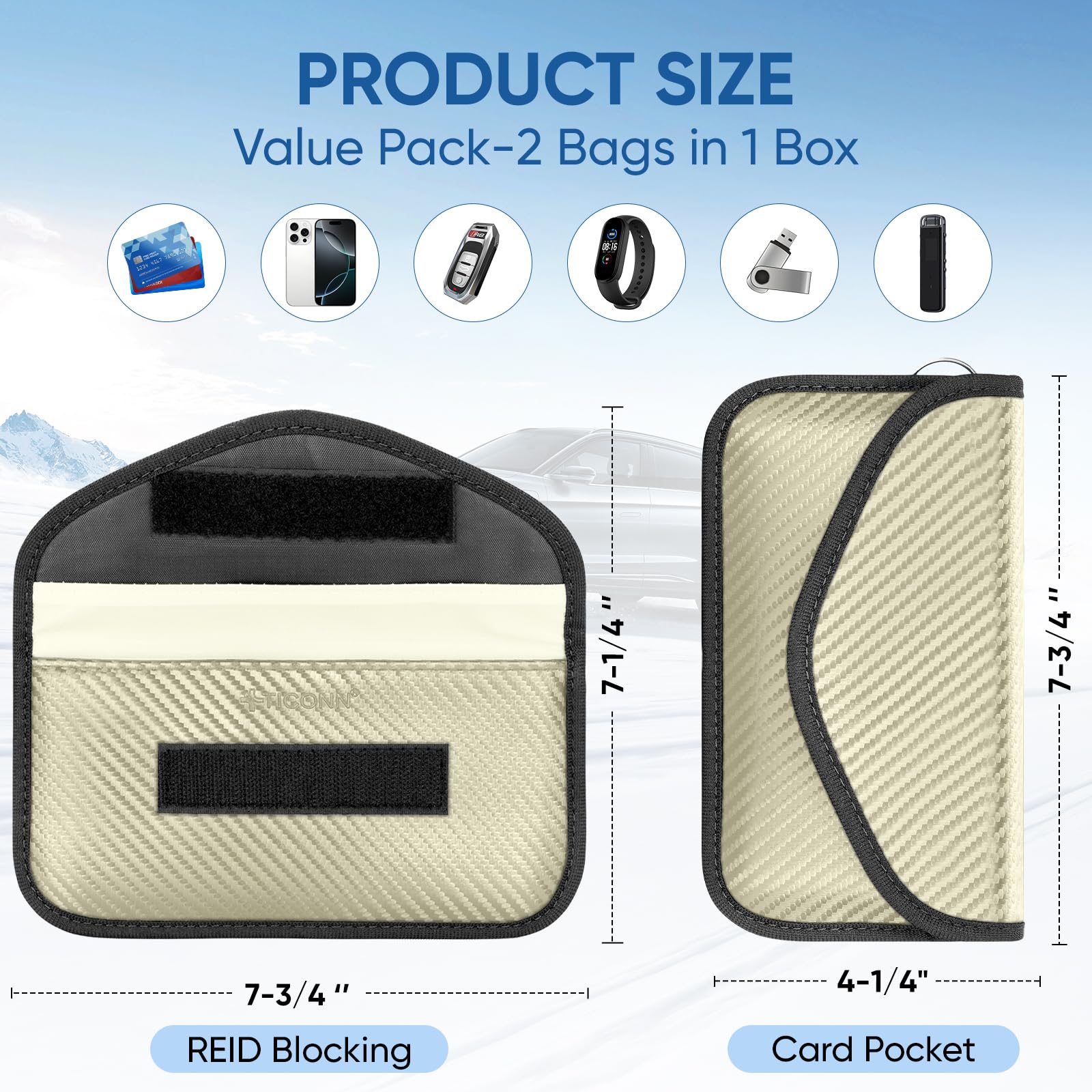 Premium Quality: TICONN faraday bag is constructed with premium carbon fiber textured material and two-layers of shielding materials packed in a gift box; It provides signal blocking functions as well as a luxurious fashionable appurtenance