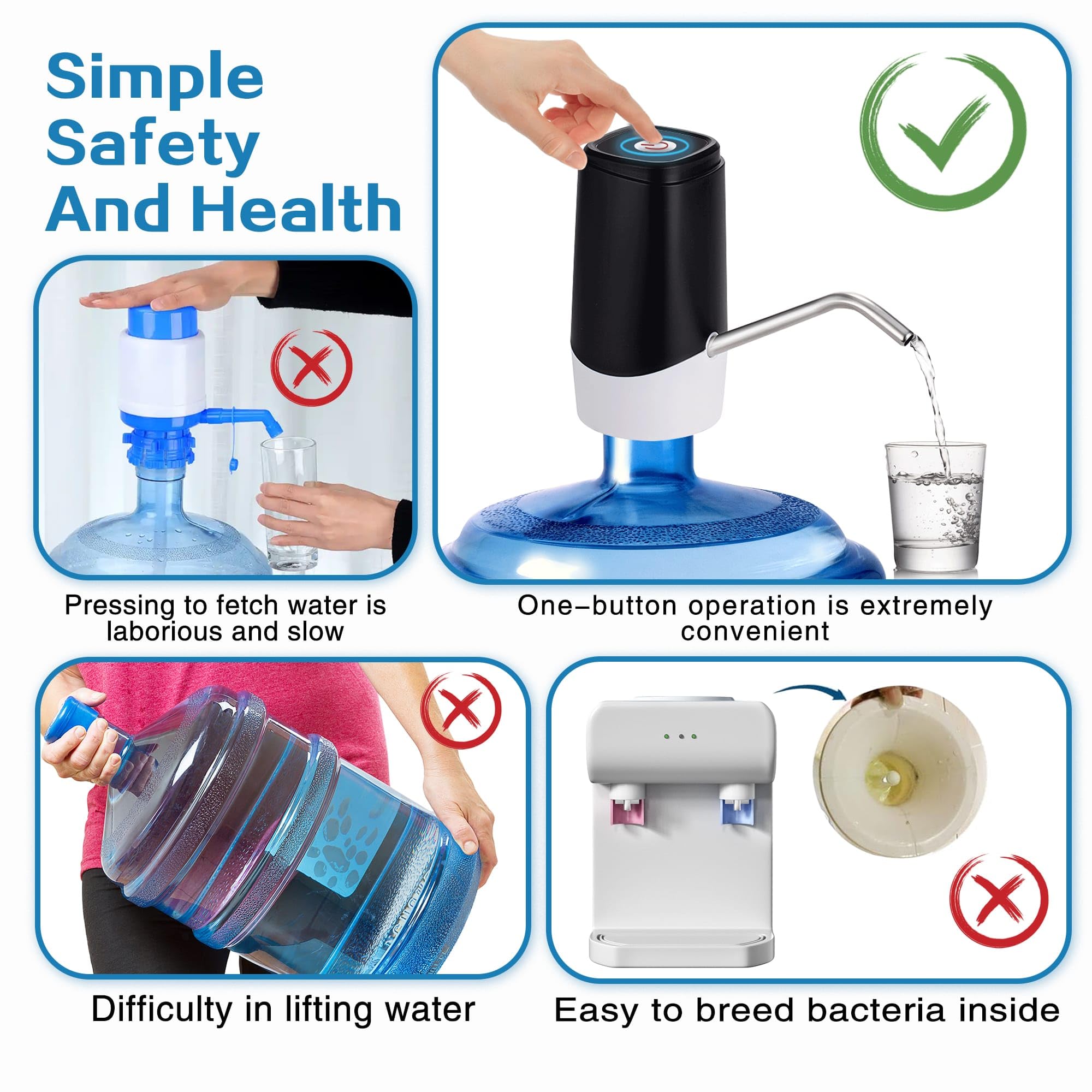 【What You Get】Package contains 1 five gallon water bottle pump, 1 304stainless steel tube, 1 food-grade silicone hose, 1 Micro USB charging cable. Portable water pump is small, making it an ideal choice for home, office, camping trips, and barbecues. You can enjoy refreshing drinking water wherever you are