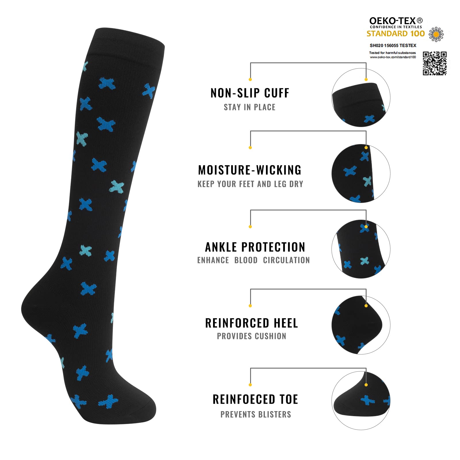 GRADUATED COMPRESSION: Our compression socks for women & men provide graduated medium compression. As the fabric moves up the leg, the compression level gradually decreases. This design works to apply specific levels of compression on certain points of your feet, ankles, and calves. You can benefit a lot from our knee high compression socks because increased circulation is always a good thing.