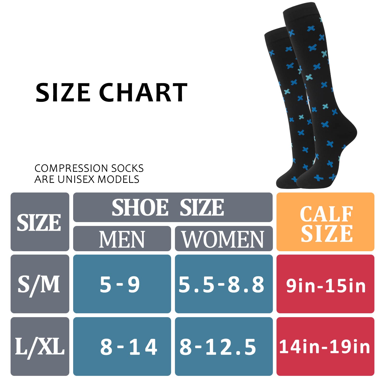 SIZE GUIDE & CARE INSTRUCTIONS: S/M fit for men shoe size 5-9, women 5.5-8.8, 9-15in calf size; L/XL fit for men shoe size 8-14, women 8-12.5, 14-19in calf size. Calf size is the primary measurement. Size up if in between sizes. It is recommended to choose our L/XL compression socks for men shoe size 9-12 with wide calves, or shoe size 13-15 with slim calves. Machine Washable. Do not iron or bleach.