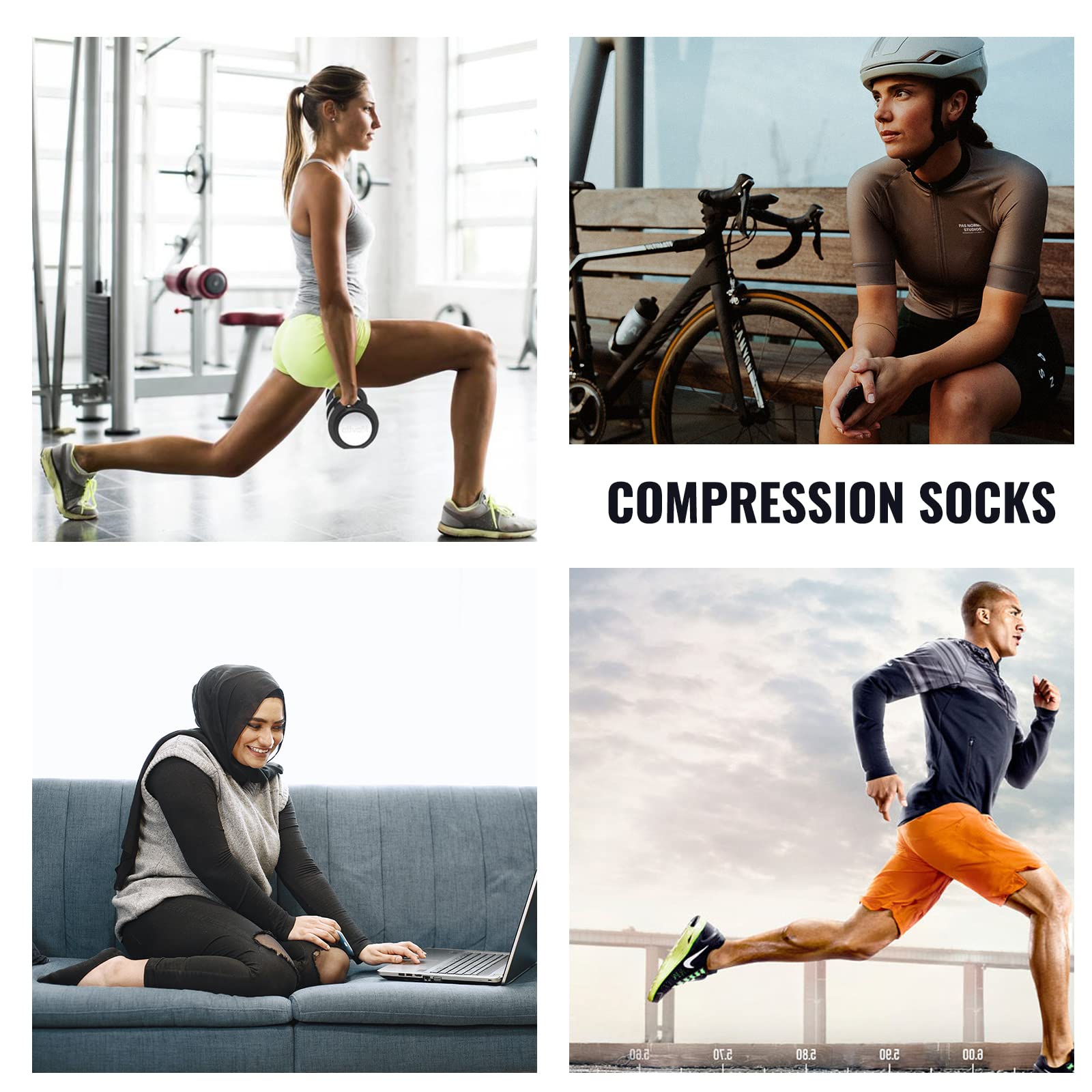 VERSATILE STYLE FOR ALL OCCASIONS: Our compression socks for men and women fit various lifestyles. Whether you're running, traveling, nursing, flying, pregnant, or need muscle support, these long compression socks men have you covered with high-quality performance. Suitable for all sports, cycling, skiing, mountain climbing, football, hiking, jogging, tennis, marathon, hockey, soccer, basketball, golf, etc. From daily wear to special occasions, experience lasting comfort.